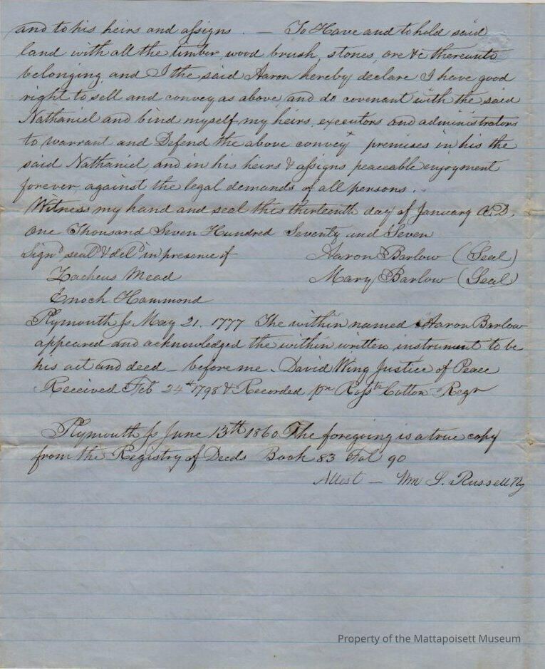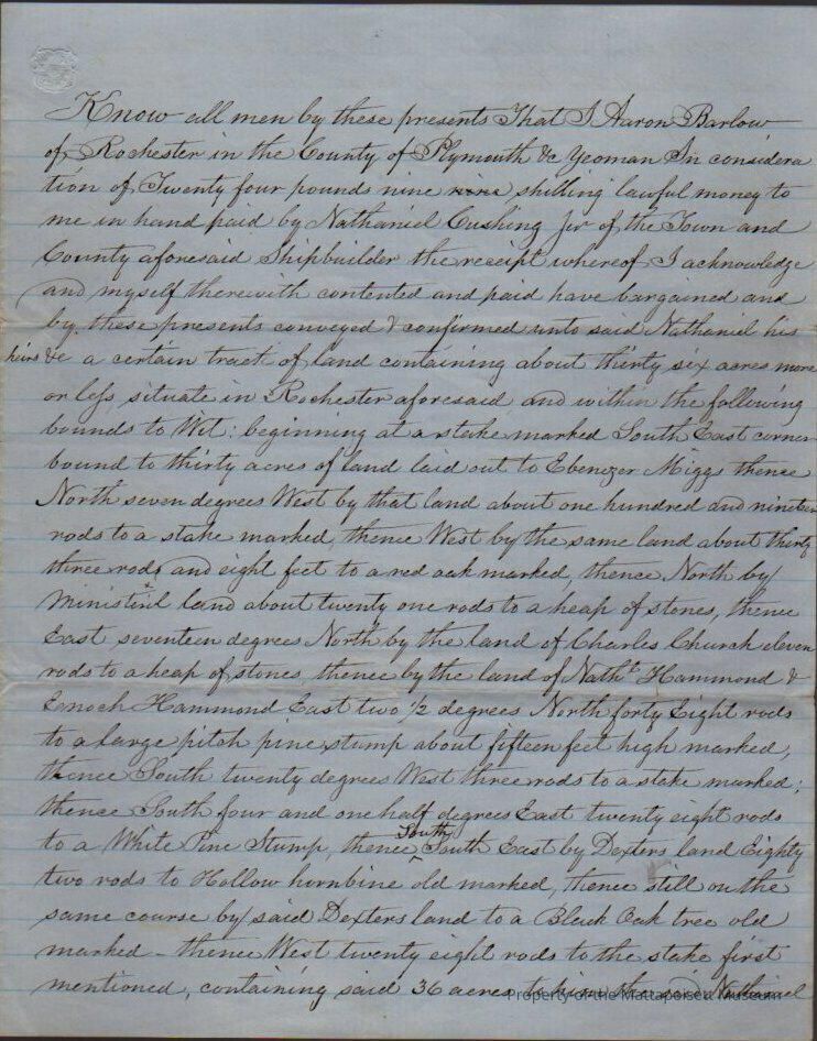 "True copy" from the Registry of Deeds, Book 83, folio 90. Aaron and Mary Barlow to Nathan Cushing (shipbuilder).Collection