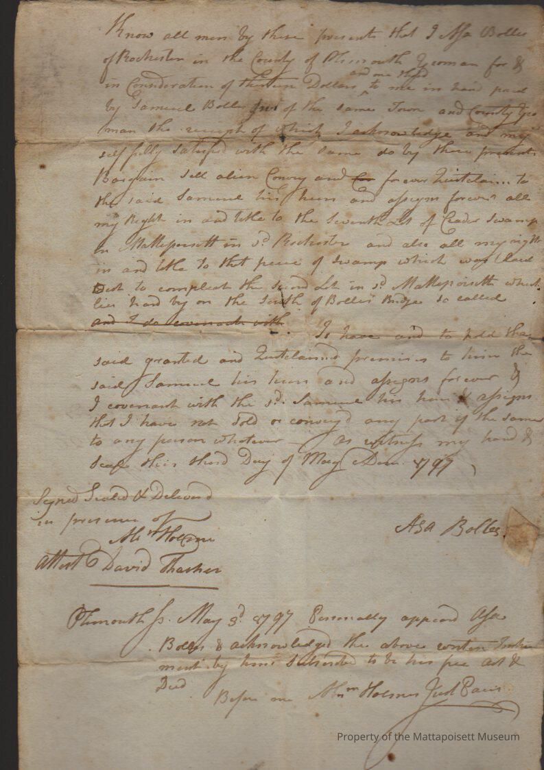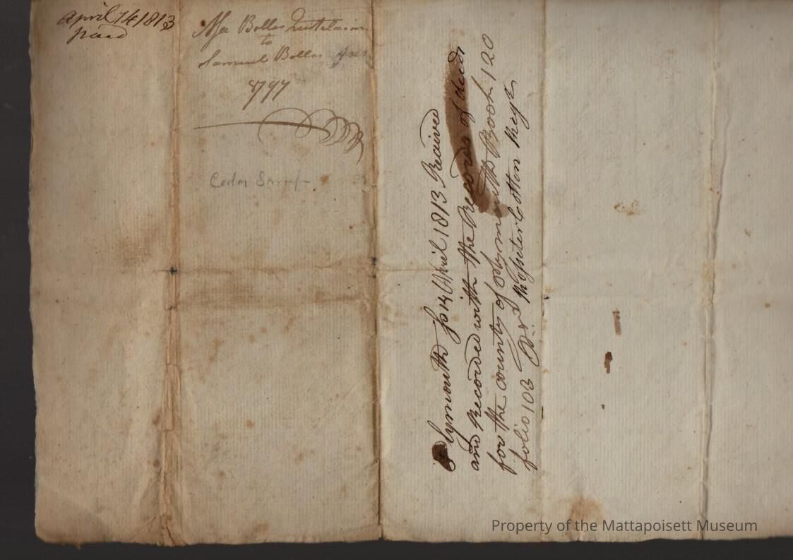 Quitclaim deed, Asa Bolles to Saumel Bolles, Cedar Swamp, paid and recorded 14 April 1813, Book 120, folio 103.Collection