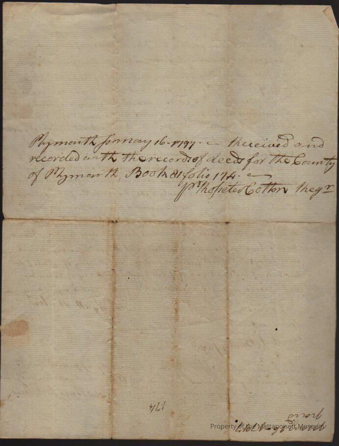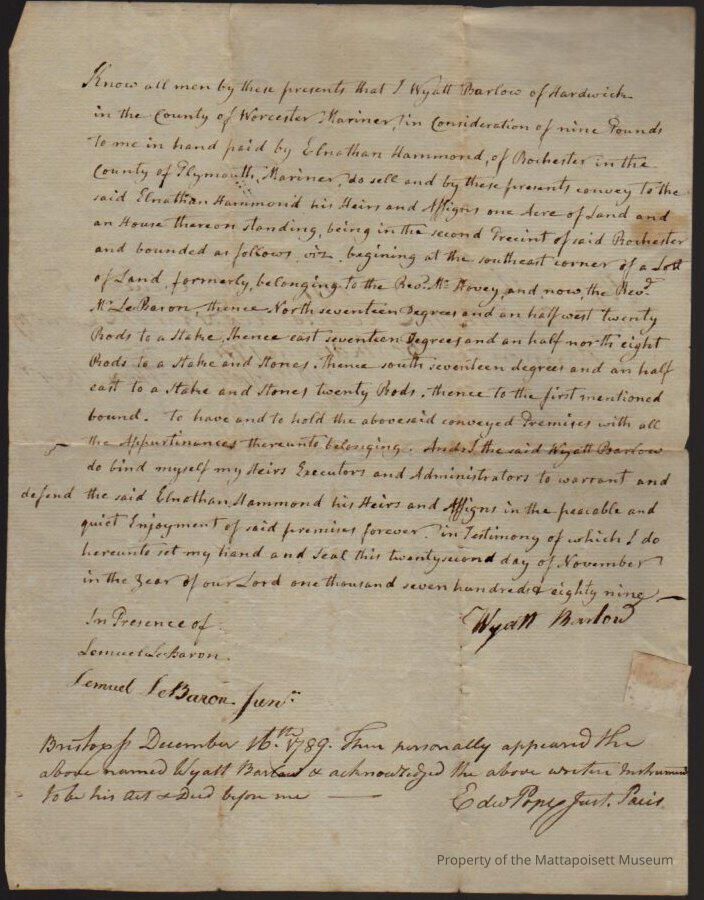 Quitclaim deed, Wyatt Barlow to Elnathan Hammond, house and land in second precinct. Paid May 16, 1797. Recorded at Registry of Deeds, Book 81, folio 174.Collection
