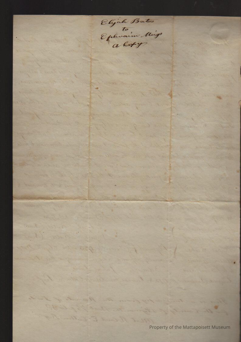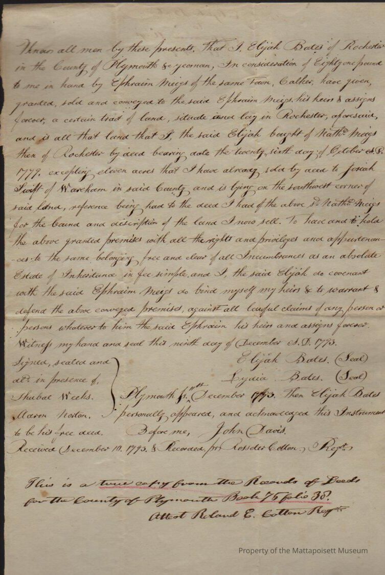 "True copy" from Registry of Deeds Book 75, folio 38. Elijah and Lydia Bares to Ephraim Meigs, portion of land previously bought of Nathaniel Meigs in 1799.Collection