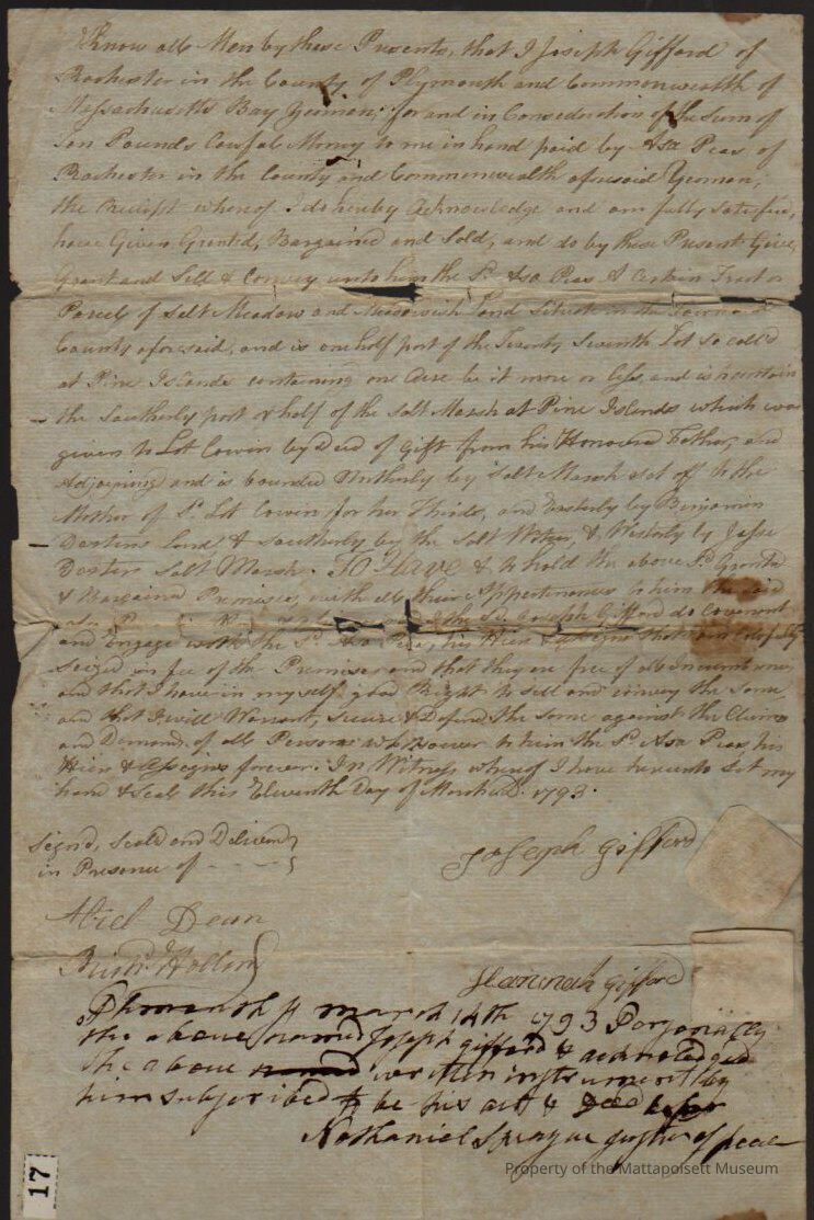Quitclaim deed, Joseph Gifford to Asa Pease. Paid Aug. 9th 1797. Recorded at Registry of Deeds, Book 82, folio 102.Collection