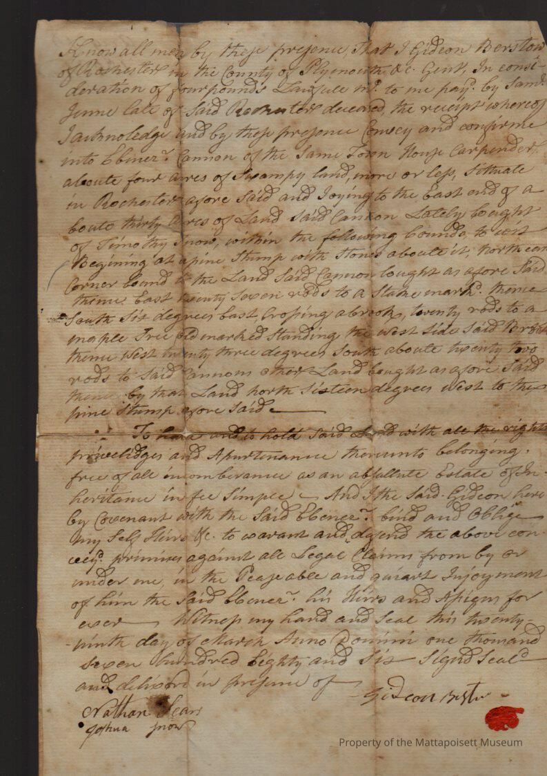 Quitclaim deed, Gideon Barstow, from Samuel Jenney, deceased, to Ebenezer Cannon, four acres of swampy land. Paid and recorded August 10th 1803, Book 97, folio 132-133.Collection