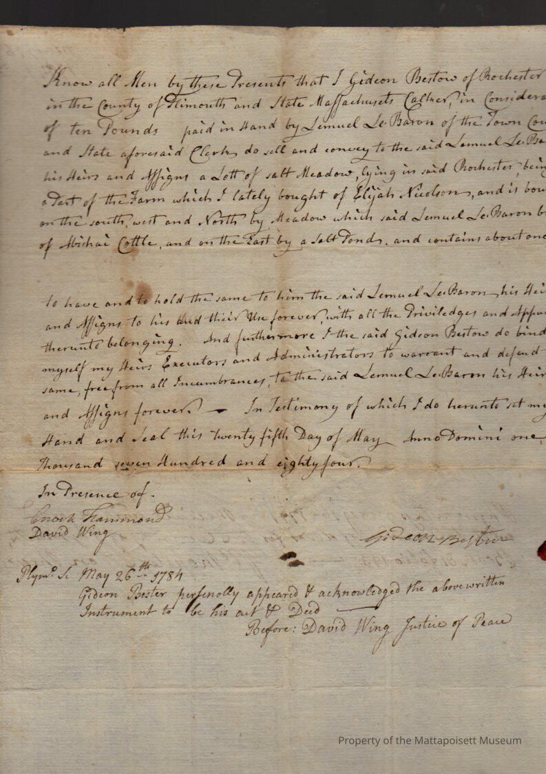 Quitclaim deed, Gideon Barstow to Lemuel LeBaron a lot of salt meadow. Paid and recorded May 16th 1797, Book 81, folio 173.Collection