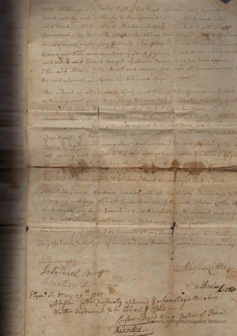 Quitclaim deed, [Abishai] and Catherine Cottle to Lemuel LeBaron, Eel Pond, and salt meadow of about four acres. Recorded April 9, 1783, Book 60, folio 227.Collection