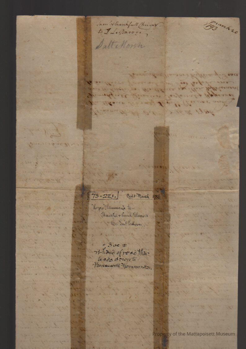 Quitclaim deed, Samuel (physician) and Thankful Cheever to Lemuel LeBaron (clerk), salt marsh in south parish. Recorded Marh 20th 1793, Book 73, folio 221.Collection