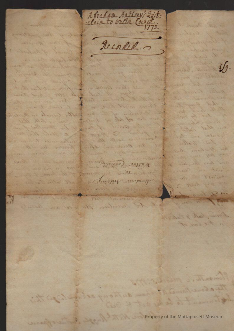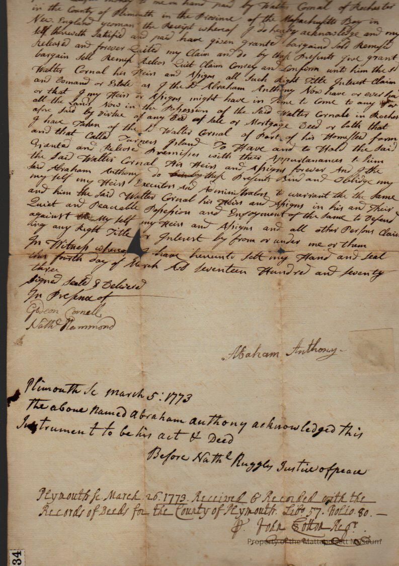 Quitclaim deed, Abraham Anthony to Walter Cornell. Recorded at Registry of Deeds, March 26, 1773, Book 57, folio 80.Collection
