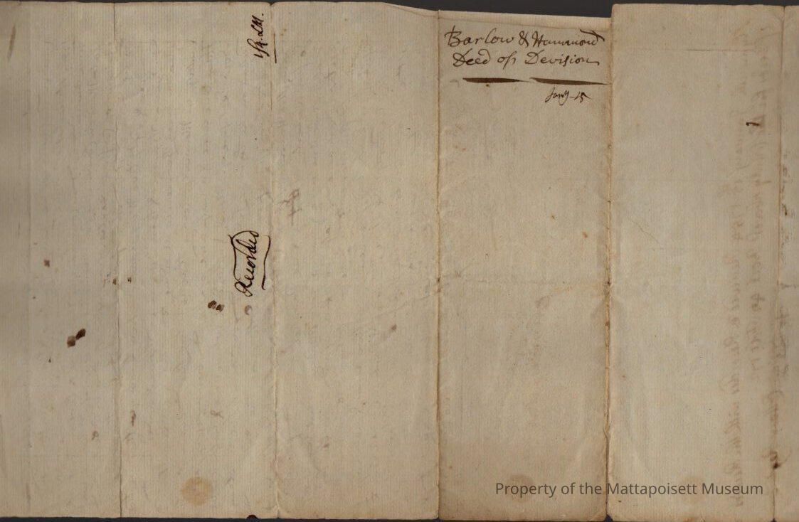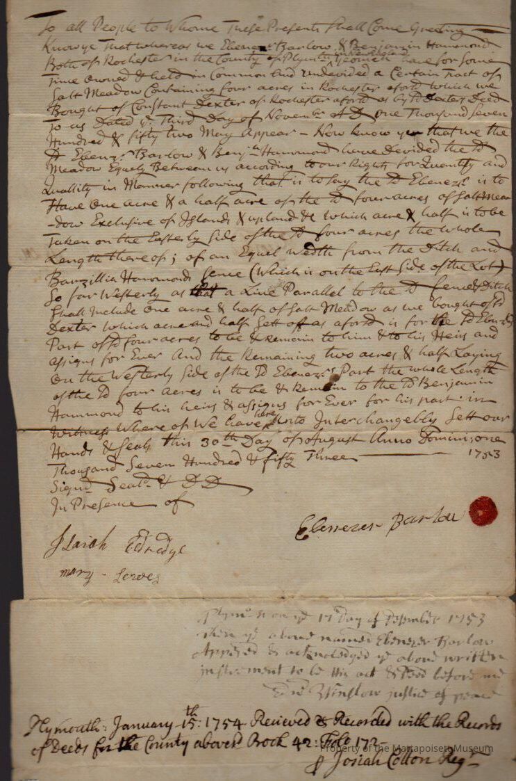 Quitclaim division deed, Ebenezer Barlow and Benjamin Hammond, land bought in common (from Comfort Dexter), division line of salt meadow. Recorded January 15th 1754, Book 42, folio 172.Collection