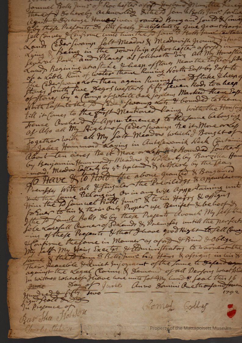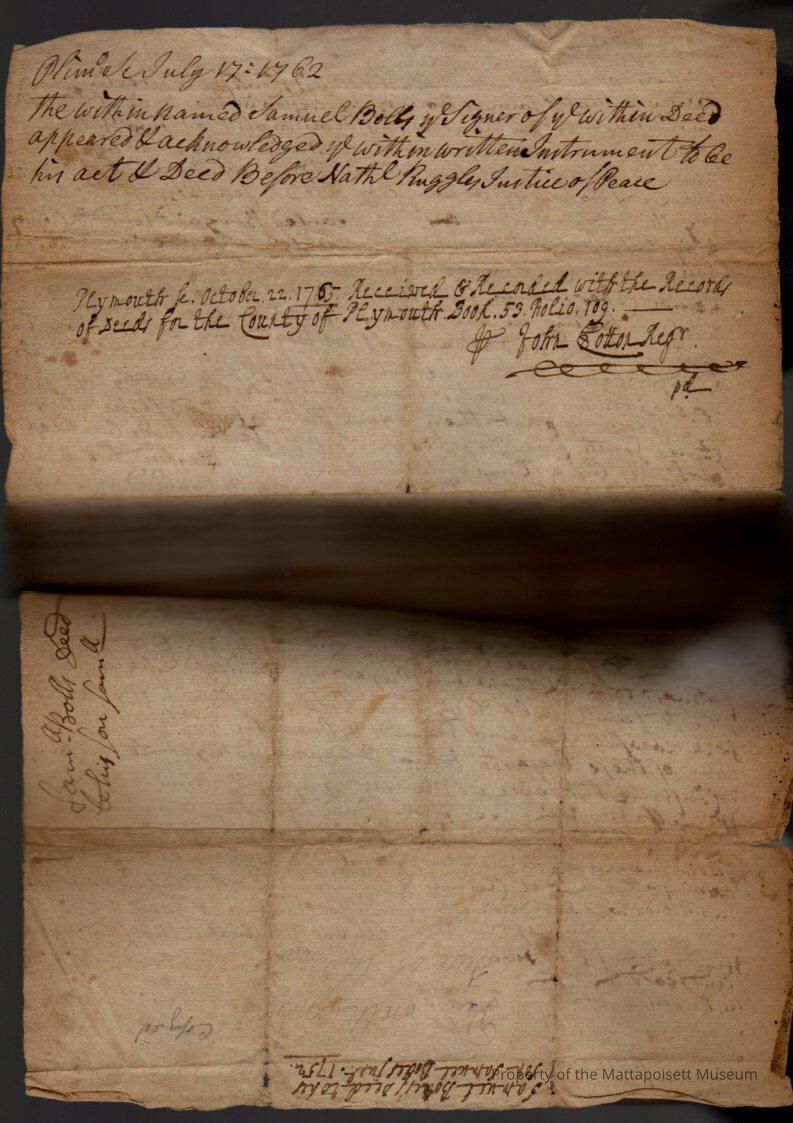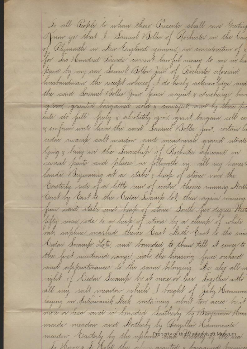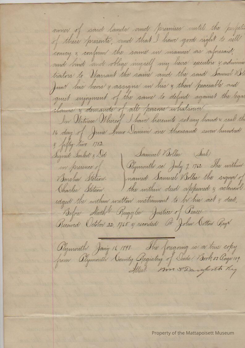 Quitclaim deed, Samuel Bolles to son Samuel Bolles. Recorded October 22, 1765, book 59, folio 109. Includes "True copy" from Registry of Deeds Book 53, page 109. Quitclaim deed of Samuel Bolles to son Samuel Bolles, June 16, 1752. Copy made January 16, 1898.Collection