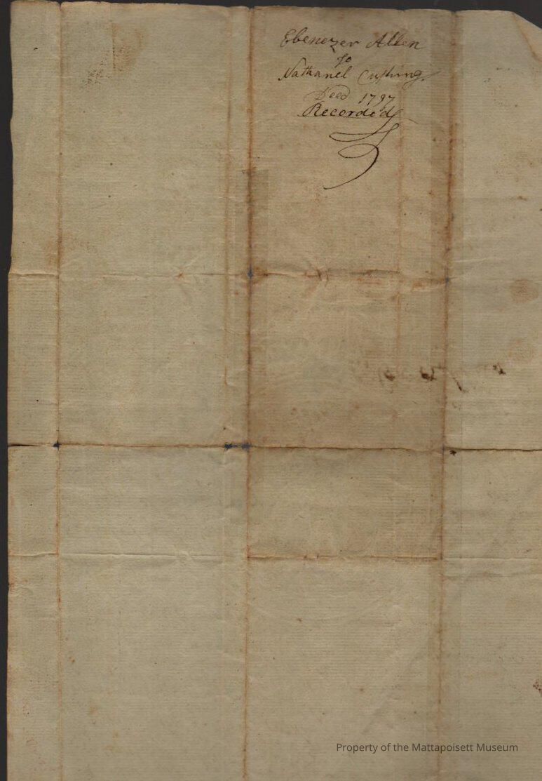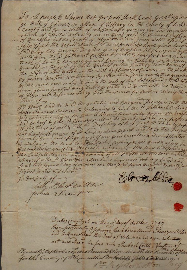 Quitclaim deed, Ebenezer Allen to Nathaniel Cushing (shipright). Swamp ground in second precinct. Recorded September 19, 1825, Book 154, folio 133.Collection