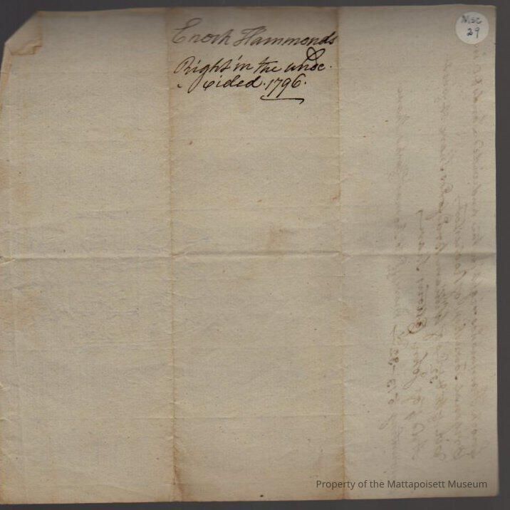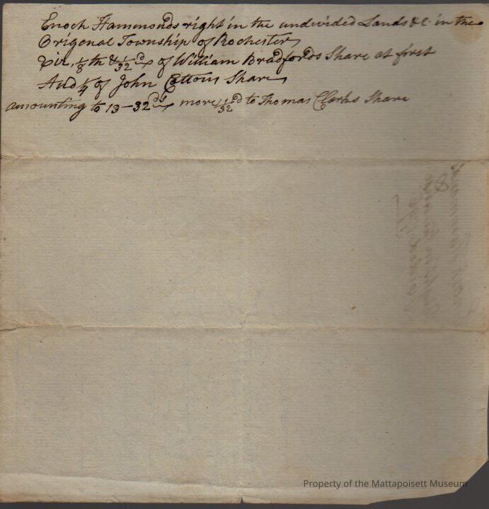Enoch Hammond's right in the undivided lands &c in the original township of Rochester. 1/8th & 1/32nd of William Bradford's share of first and 1/4the of John Cotton's share. Amounting to 13-32 up more 11/32nd to Thomas Clark's share.Collection