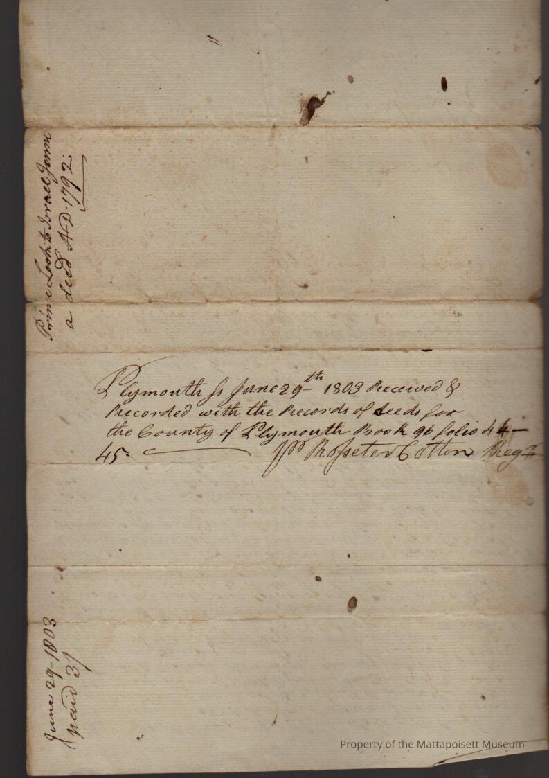 Quiclaim deed, Prince and Sarah Look to Isreal Jenne, eight acres, 80 rods of swampy land. Recorded June 29th 1803, Book 96, folio 44.Collection