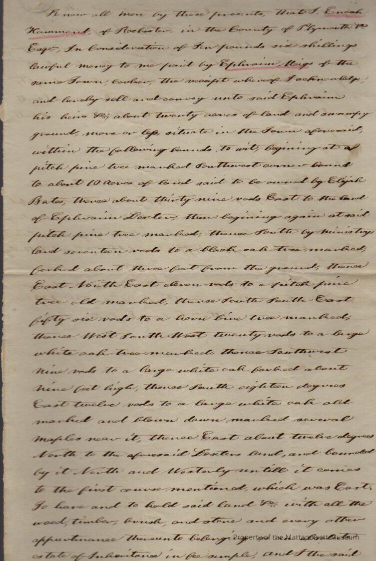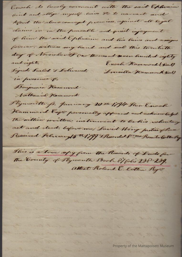"True copy" from Registry of deeds, Book 87, folio 238-239. Enoch and Drucilla Hammond to Ephraim Meigs. Twenty acres land and swampy ground.Collection
