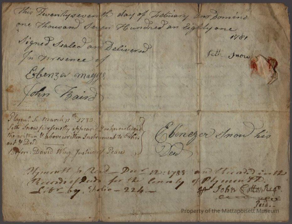 Deed information, Seth Snow to Ebenezer Snow. Recorded December 12, 1783, Libr 67, folio 224.Collection