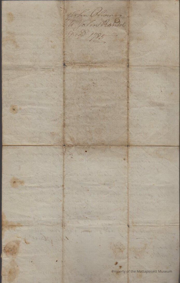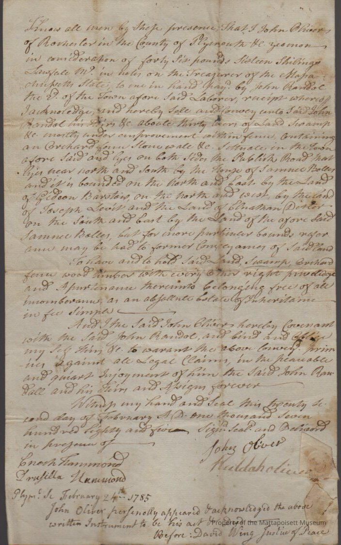 Quitclaim deed, John and Keildah Oliver to John Randall (laborer) 30 acres of land with an orchard.Collection