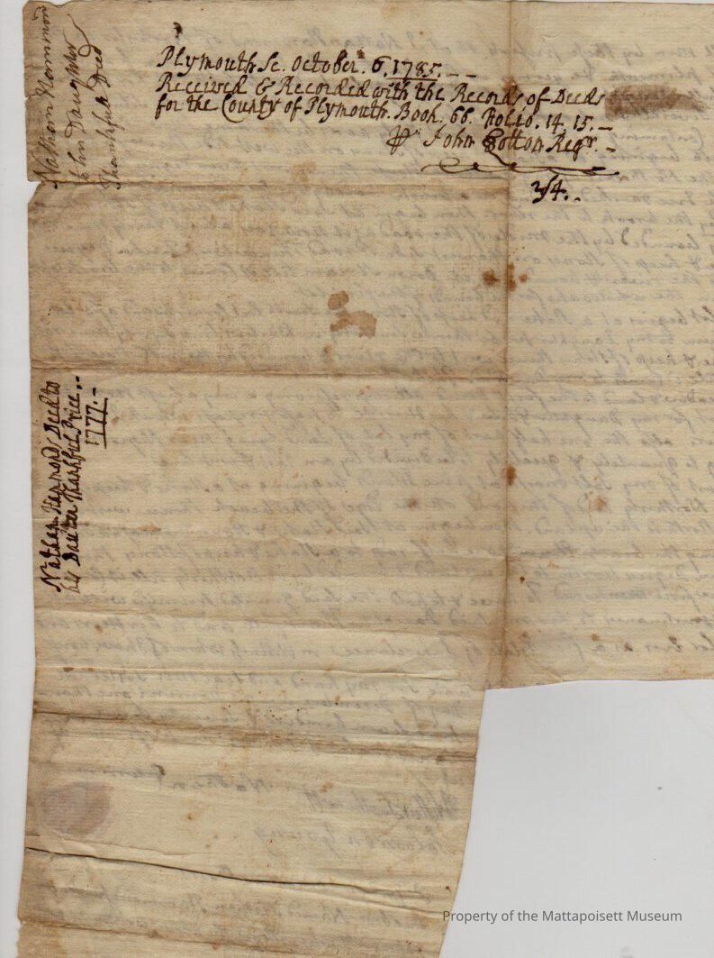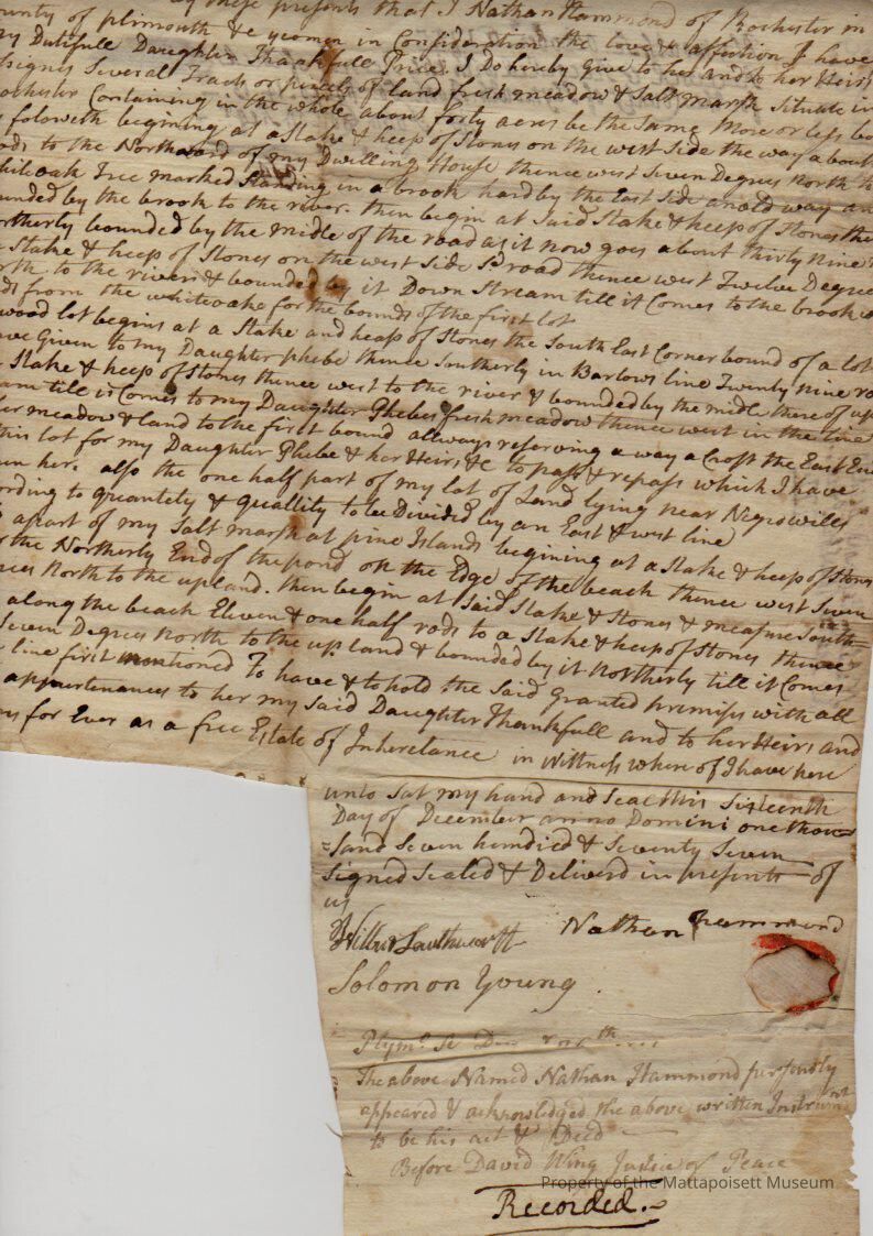 Quitclaim deed, Nathan Hammond to "dutiful daughter" Thankful Price meadow and salt marsh. Recorded October 6, 1785, Book 66, folio 14-15.Collection