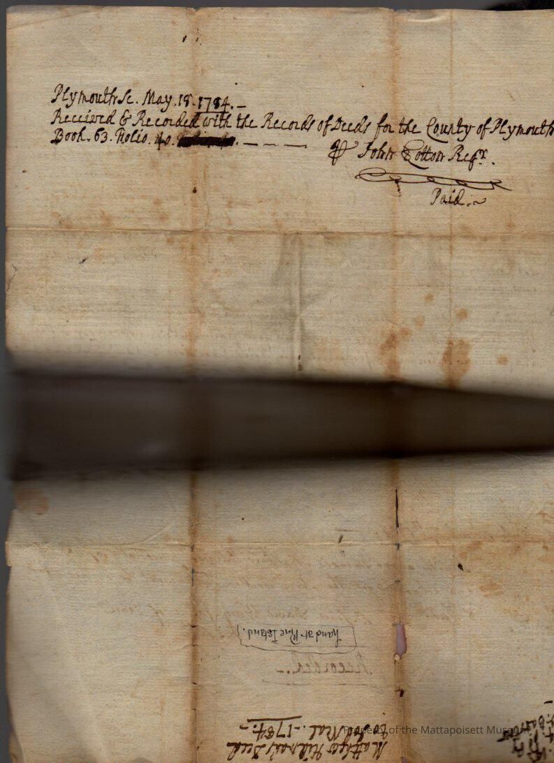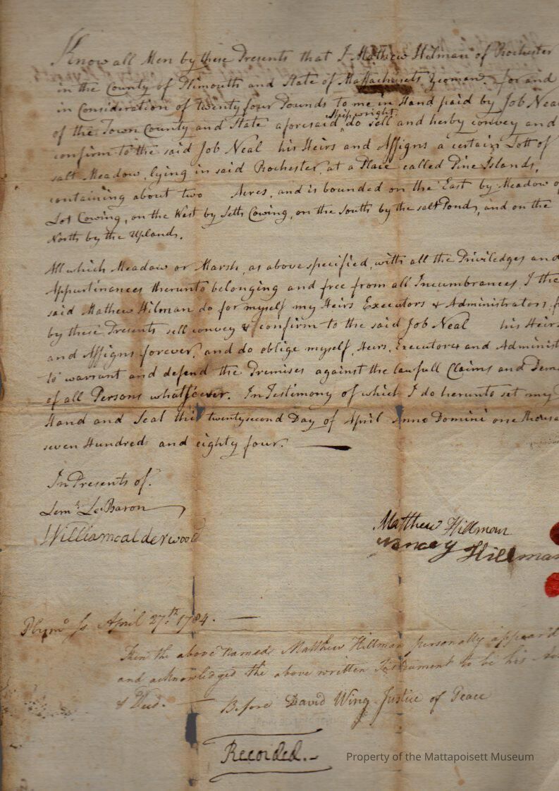 Quitclaim deed, Matthew and Nancy Hillman to Job Neal, salt meadow at a place called Pine Islands. Recorded May 19, 1784, book 63, folio 40.Collection