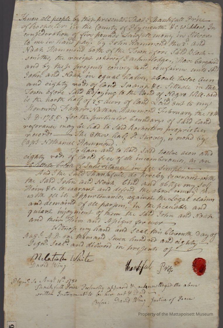 Quitclaim deed, Thankful Price to John Hammond and Noah Hammond (blacksmiths), in equal halves, 12 acres, 80 rods.Collection