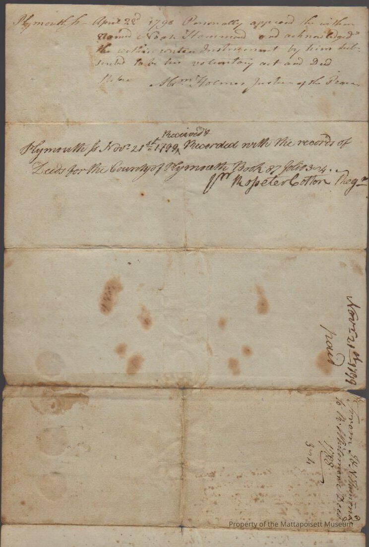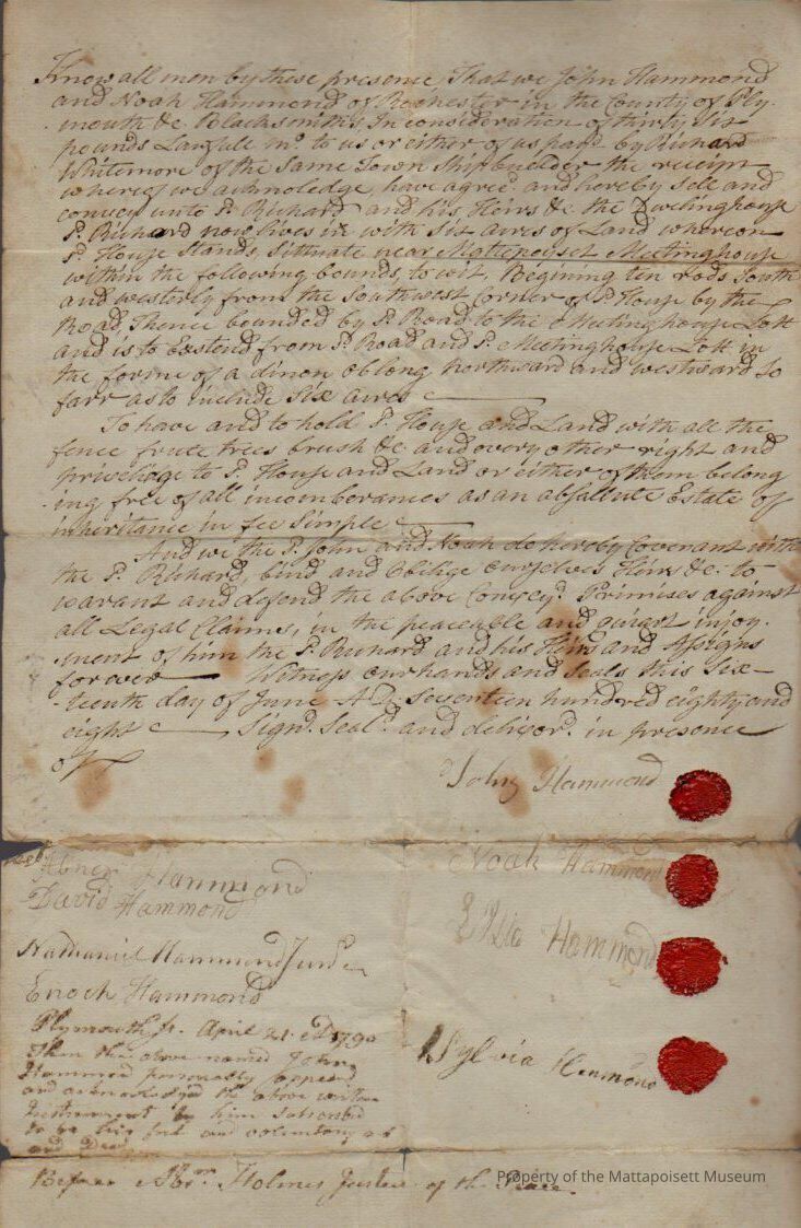 Quitclaim deed, John Hammond and Noah Hammond (blacksmiths) to Richard Whitmore (shipbuilder), six acres with house. Recorded November 21st 1799, Book 87, folio 3-4.Collection