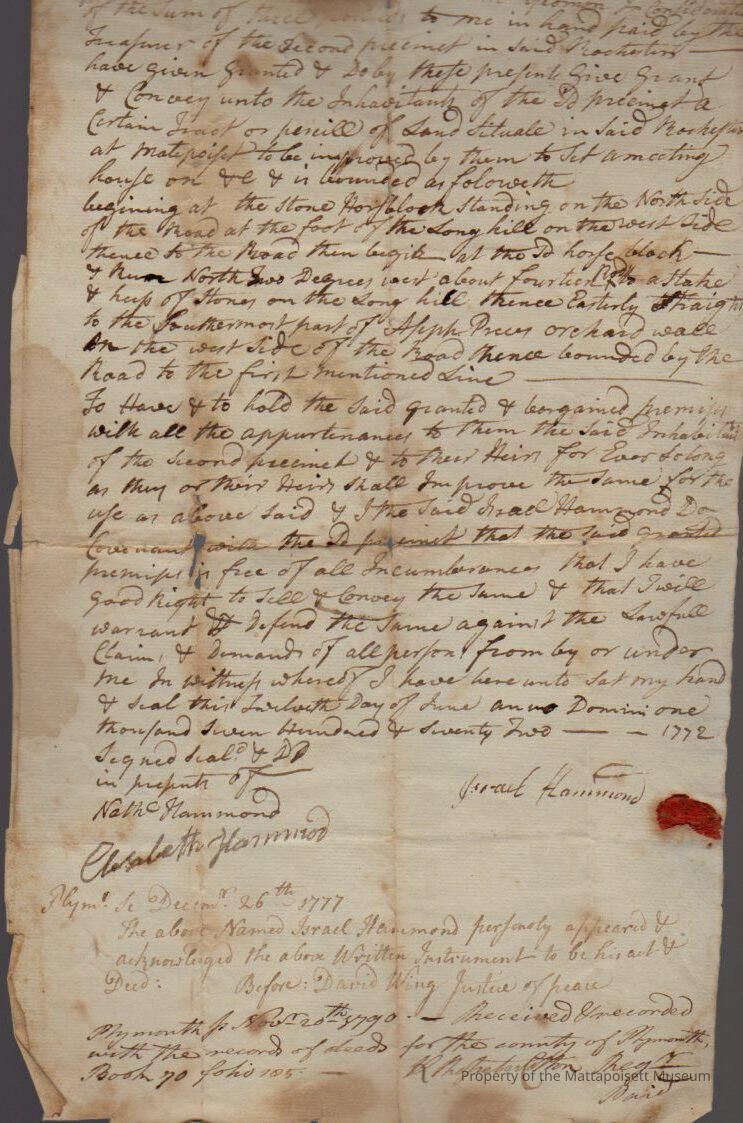Quitclaim deed from Isreal Hammond to the in habitants of the precinct, paid by Treasurer of the second precinct, parcel in "Matipoisit" to build a meeting house.Collection