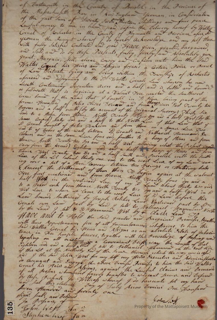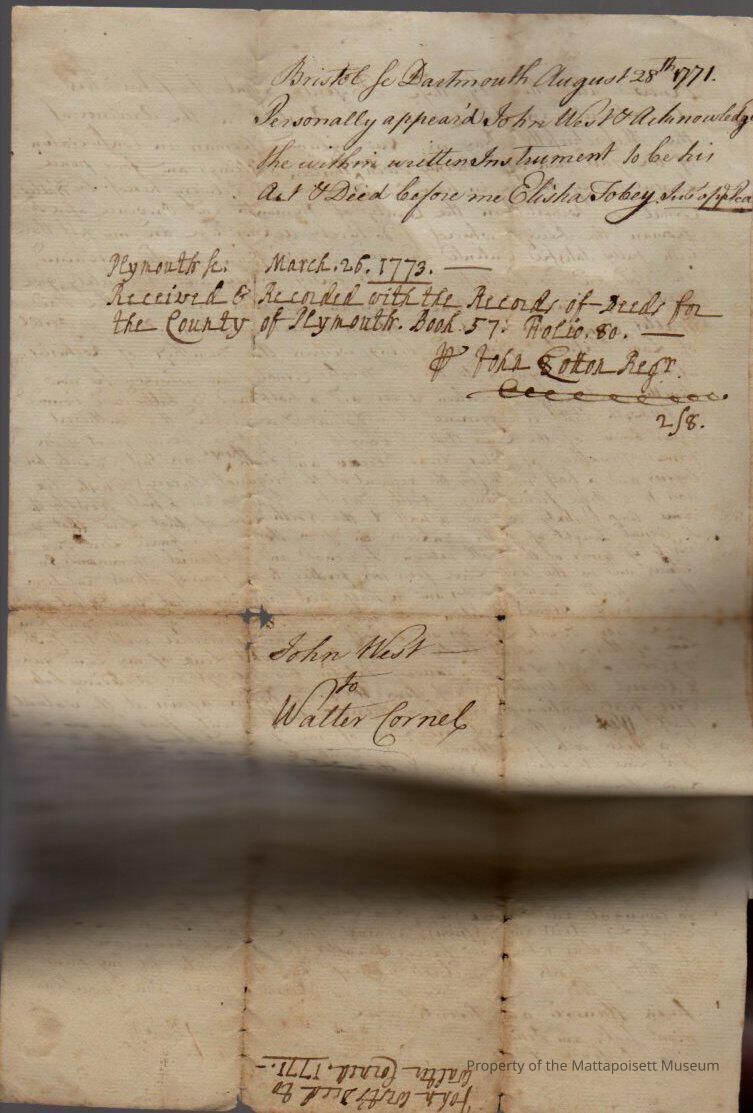 Quitclaim deed, John West to Walter Cornel, 17 acres and a half. Recorded March 26, 1773, book 57, folio 80.Collection