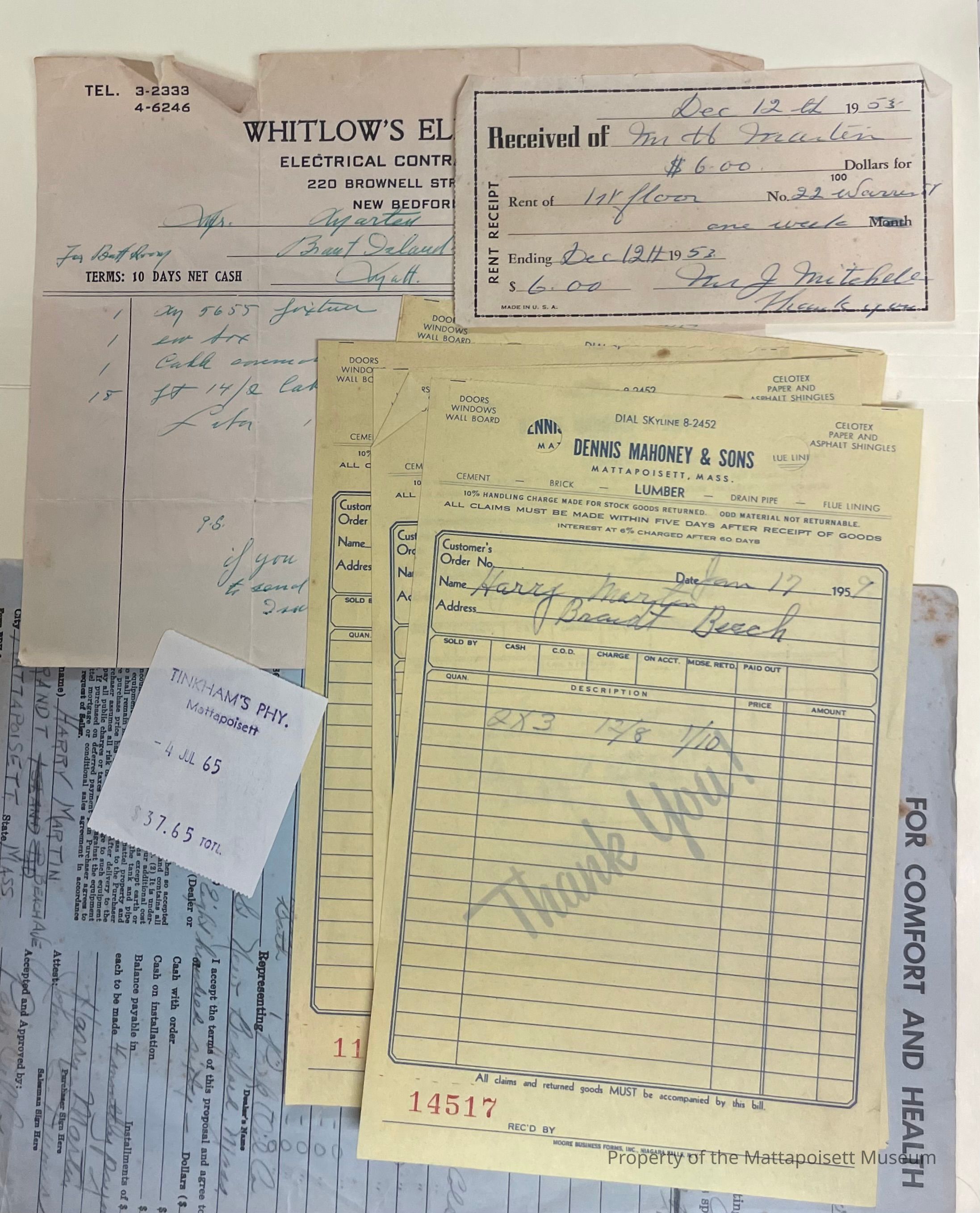 Collection of receipts from local businesses: Dennis Mahoney& Sons, Whitlow's Electric, Tinkham's Phy., rent reciept for Warren Street.Context