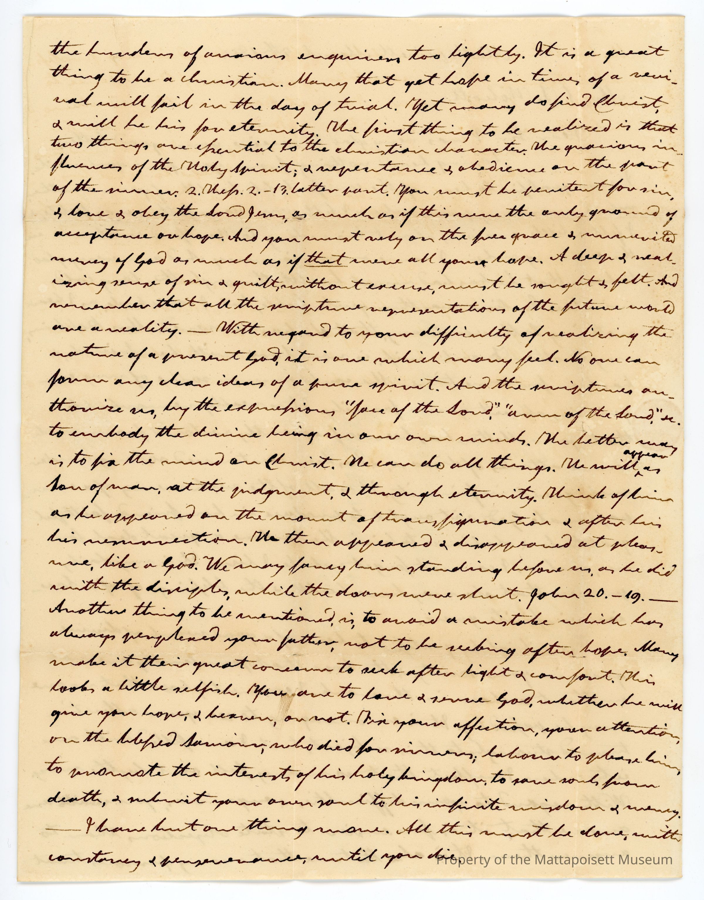 I am highly gratified to hear of a good work of divine grace in your society, and the hope that your family are not without a share in the work. I earnestly hope that no one may be passed by. It is encouraging to see your attention turned strongly to this subject, but I am filled with anxiety when I reflect that so many fall out by the way. With regard to your difficulties and enquiries, you are aware that it is far easier to state objections than to answer them. It is also true that many persons trust the burdens of anxious enquiries too lightly. It is a great thing to be a christian. Many that get hope in times of a revival will fail in the day of trial. Yet many do find Christ, and will be his for eternity. The first thing to be realized is that two things are essential to the Christian character. The gracious influences of the Holy Spirit; and repentance and obedience on that on the part of the sinner. 2. Thess. 2.-13. Latter part. You must be penitent for sin, and love, and obey the Lord Jesus, as much as if this were the only ground of acceptance or hope. And you must rely on the free grace and ---mercy of God as much as if that were all your hope. A deep and realizing sense of sin and guilt, without excuse, must be sought and felt. And remember that all the scripture representation of the future world are a reality. With regard to your difficulty of realizing the nature of a present God, it is one which many feel. No one can form any clear ideas of a pure spirit. And the scriptures authorize us, by the expressions “face of the Lord,” “arm of the Lord,” se. To embody the divine being in our own minds. The better way is to fix the mind on Christ. He can do all things. He will appear as Son of man, at the judgment, and through eternity. Think of him as he appeared on the mount of transfiguration and after his resurrection. He then appeared and disappeared at pleasure, like a God. We may fancy him standing before us, as he did with the disciples, while the doors were shut. John 20.-19.- Another thing to be mentioned, is, to avoid a mistake which has always perplexed your father, not to be seeking after hope. Many make it their great concern to seek after light and comfort. This looks a little selfish. You are to love and serve God, whether he will give you hope, and heaven, or not. Fix your affection, your attention, on the blessed Savior, who died for sinners; labour to please him, to promote the interests of his holy kingdom, to save souls from death, and submit your own soul to his infinite wisdom and energy. I have but one thing more. All this must be done with constancy and perseverance, until you die.