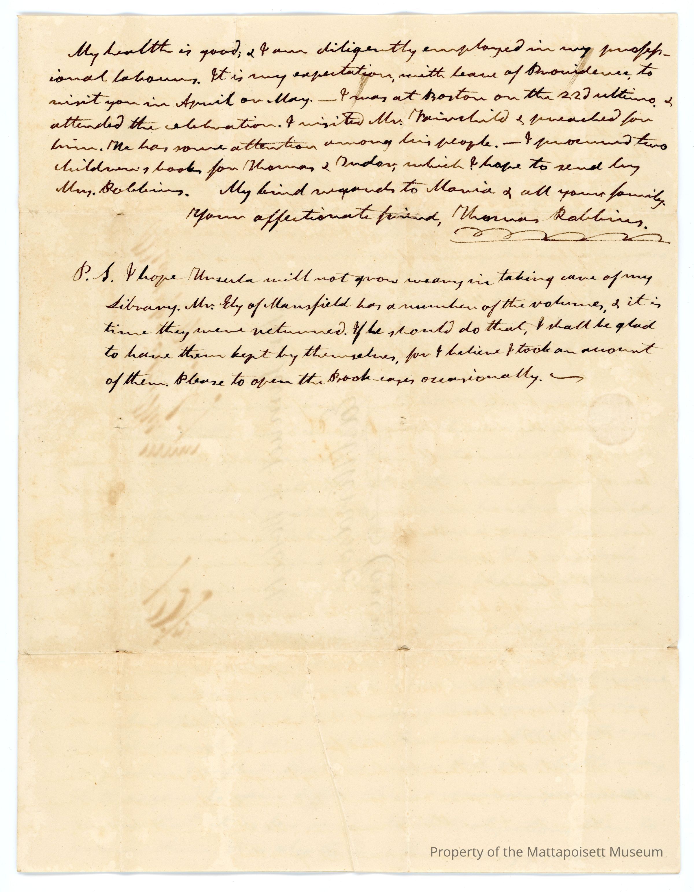 P.S. I hope Ursula will not grow weary in taking care of my library. Mr. Ely of Mansfield has a number of the volumes, and it is time they were returned. If he should do that, I shall be glad to have them kept by themselves, for I believe I took an account of them. Please to open the Book-cases occasionally.