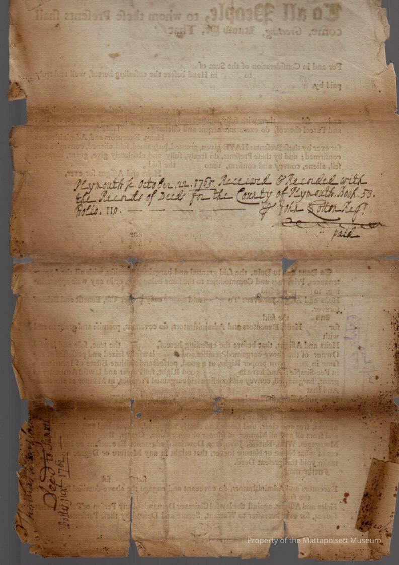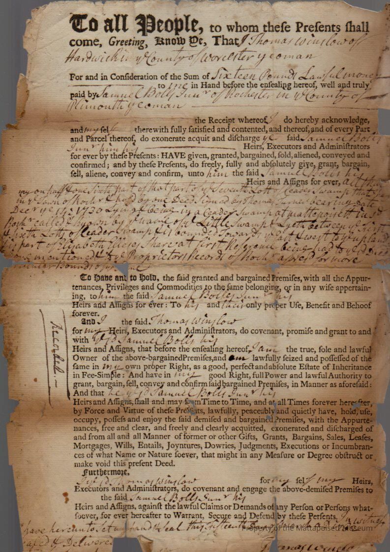 Quitclaim deed, Thomas Winslow to Samuel Bolles Jr. Recorded October 22, 1765, book 59, folio 110.Collection