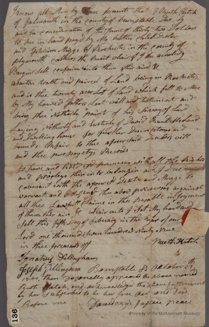 Quitclaim deed, Ruth Hatch to brother Charles Dexter and Ephraim Meigs, 20 acres. Recorded January 24th 1803, book 95, olio 122.Collection