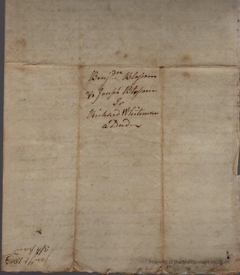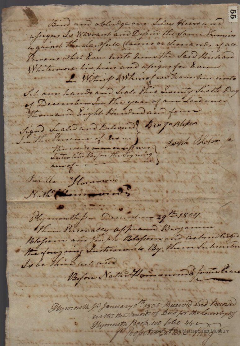 Quitclaim deed, Benjamin Blossom and Joseph Blossom to Richard Whitmore. Recorded January 7th 1805, book 100, folio 44.Collection