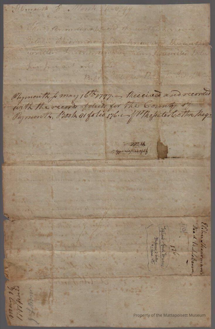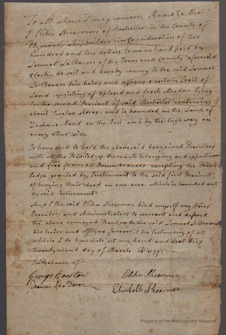 Quitclaim deed, Elihu Shearman (shipbuilder) to Lemuel LeBaron (clerk), upland and fresh meadow in second precinct about 12 acres. Recorded May 16th 1797.Collection