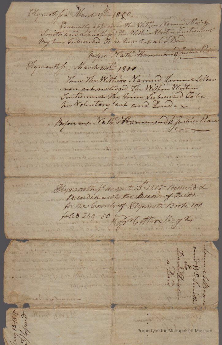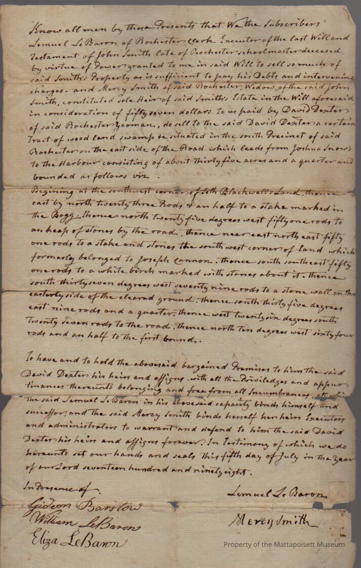 Quitclaim deed, Lemuel LeBaron, executor of the estate of John Smith (school master), deceased, to David Dexter, 35 acres wood land and swamp in south precinct, money to pay off debts of John Smith and money to Mary Smith. Recorded August 13th 1805, book 100, folio 249-250.Collection