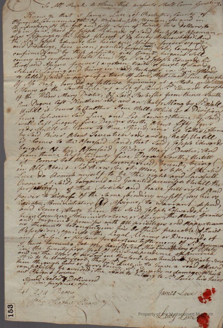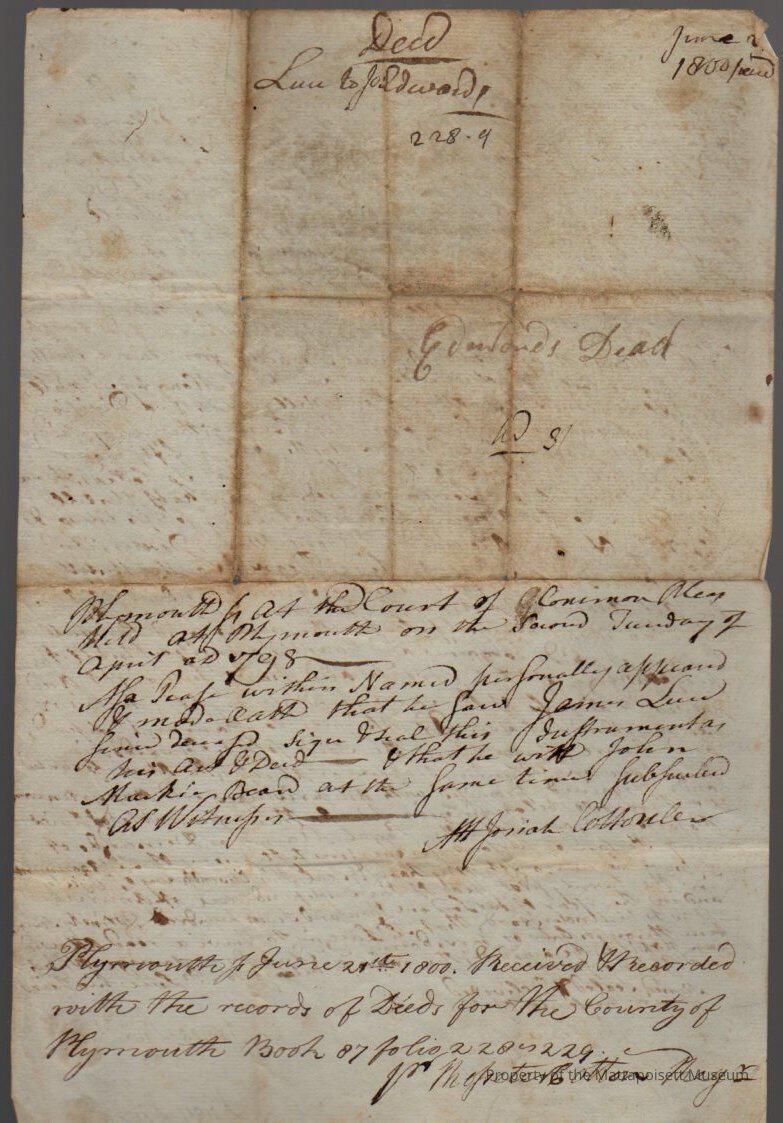 Quitclaim deed, James and Lucy Luce to Joseph Edwards in Pine Islands. Recorded June 21st 1800, book 87, folio 228-229.Collection