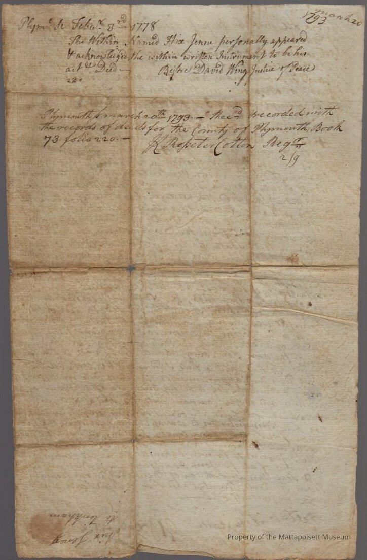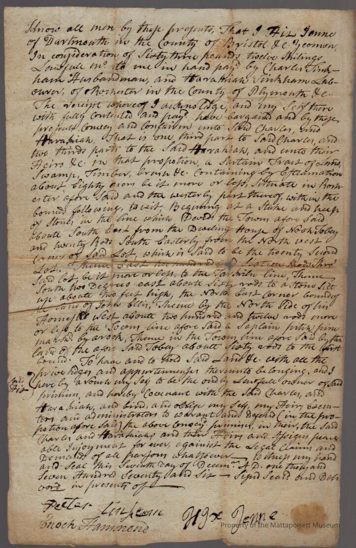 Quitclaim deed, Hix Jenne to Charles Tinkham (1/3) and Hanamiah Tinkham (2/3), about 80 acres. Recorded March 20th 1793, book 73, folio 220.Collection