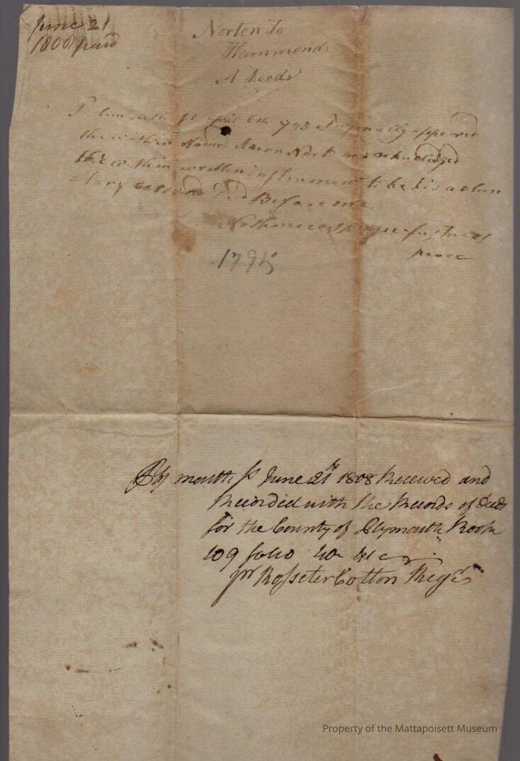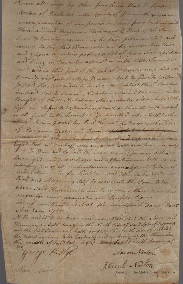 Quitclaim deed, Aaron and Abigail Norton to Hunnewill Hammond and Benjamin Hammond part of Cedar Swamp. Recorded June 21st 1808, book 109, folio 40-41.Collection