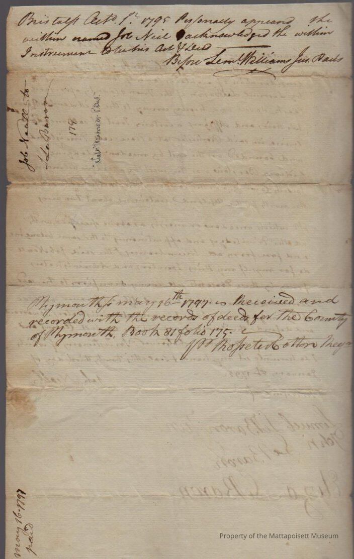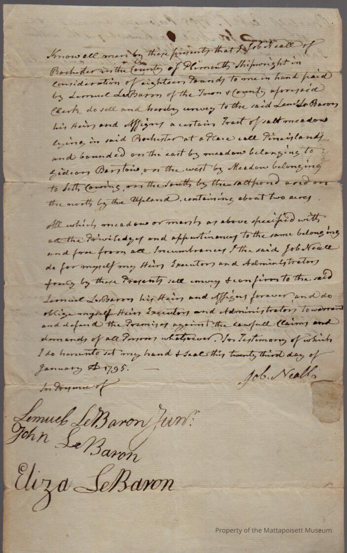 Quitclaim deed, Job Neall (shipwright) to Lemuel LeBaron (clerk), "Salt Meadow Pond", Pine Island. Recorded May 16th 1797, book 81, folio 175.Collection
