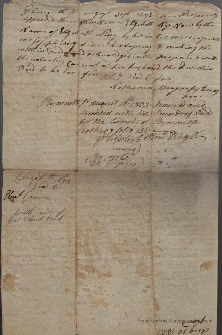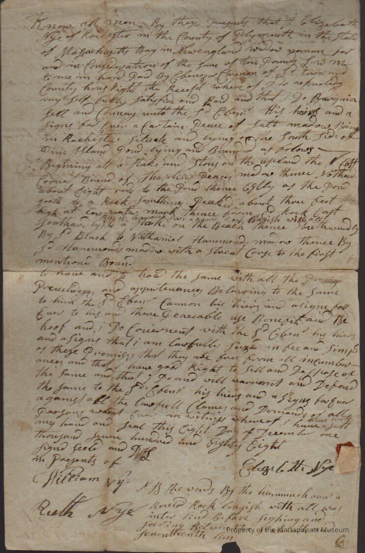 Quitclaim deed, Elizabeth Nye (widow) to Ebenezer Cannon, salt meadow on the south side of Pine Island. Recorded August 16th 1803, book 97, folio 134.Collection