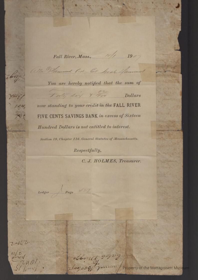 Quitclaim deed, Samuel Booles (yeoman) to Caleb Meigs (calker), 1/3 part of the seventh lot of Cedar Swamp known as "Little Cedar Swamp" in "Mattepoyssett". Notice of credit at Fall River Five Cents Savings bank, not entitled to interest (10/1/1907).Collection