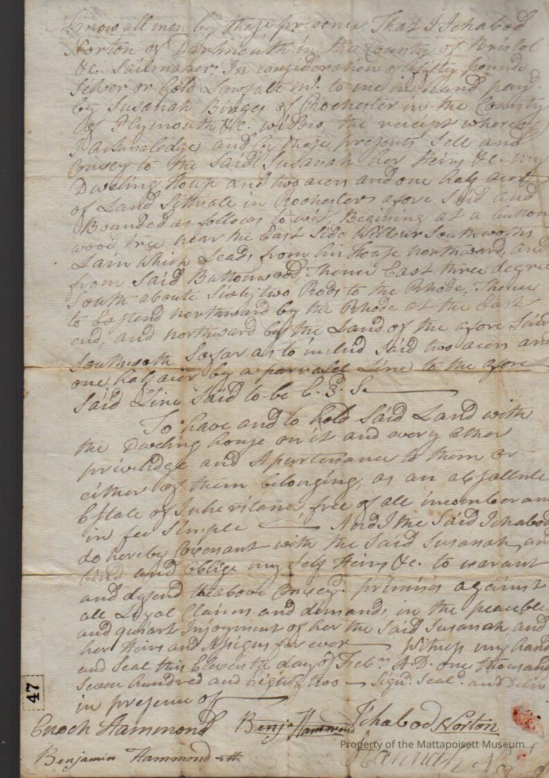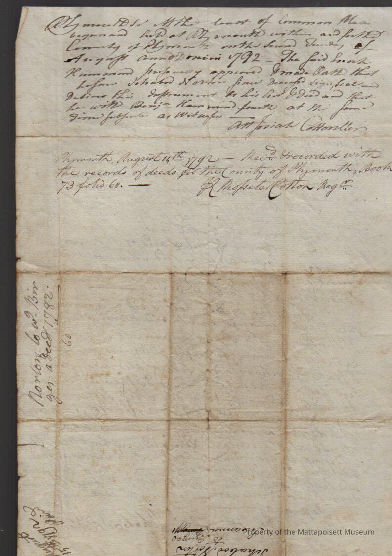 Quitclaim deed, Ichabod (sailmaker) and Hannah Norton to Susanah [Binger] (widow), two and one half acres and a dwelling house. Recorded August 15th 1792, book 73, folio 68.Collection