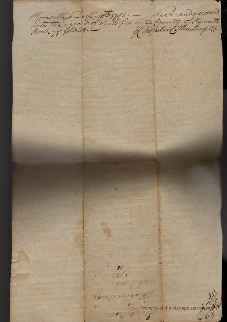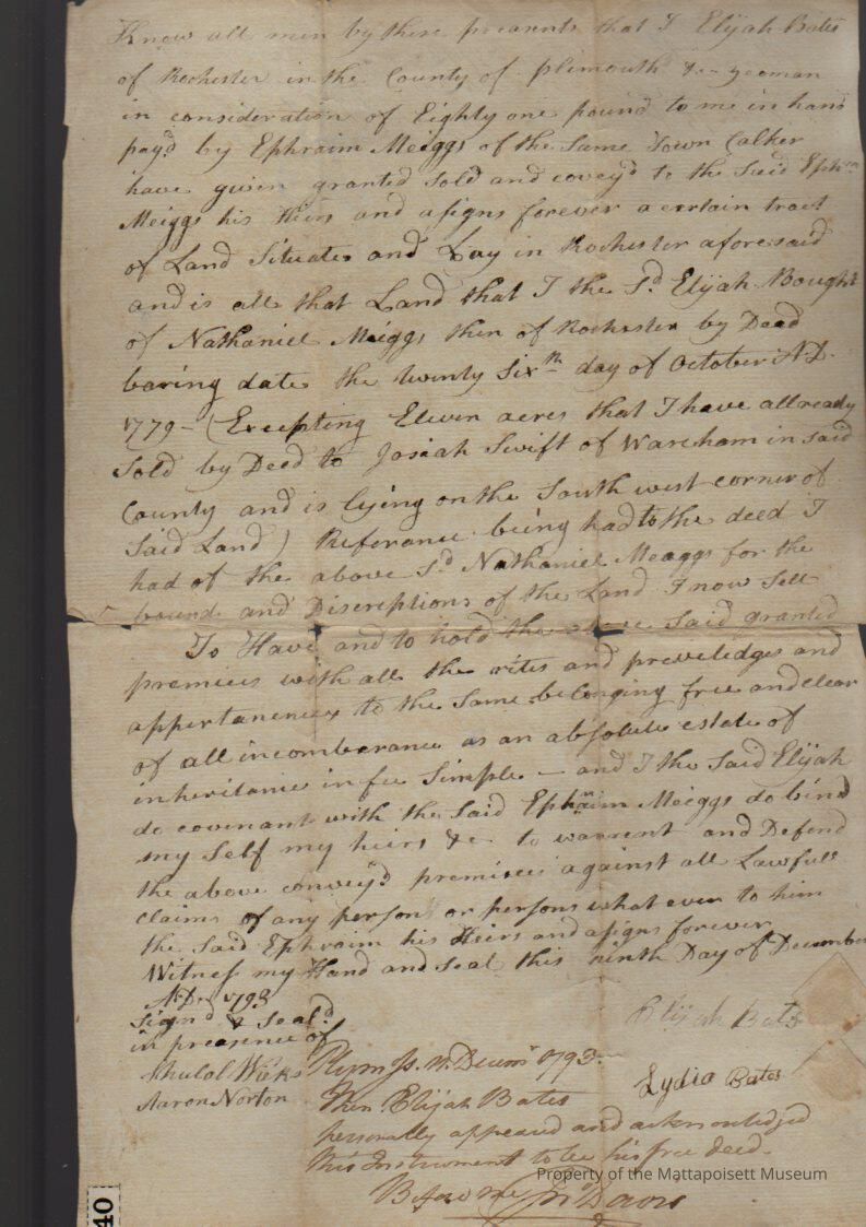 Quitclaim deed, Elijah (yeoman) and Lydia Bates to Ephraim Meigs (caulker), previously purchased by Nathaniel Meiggs on twenty sixth day of October 1779 (except 11 acres already sold to Josiah Swift). Recorded December 10th 1793, book 75, folio 38.Collection
