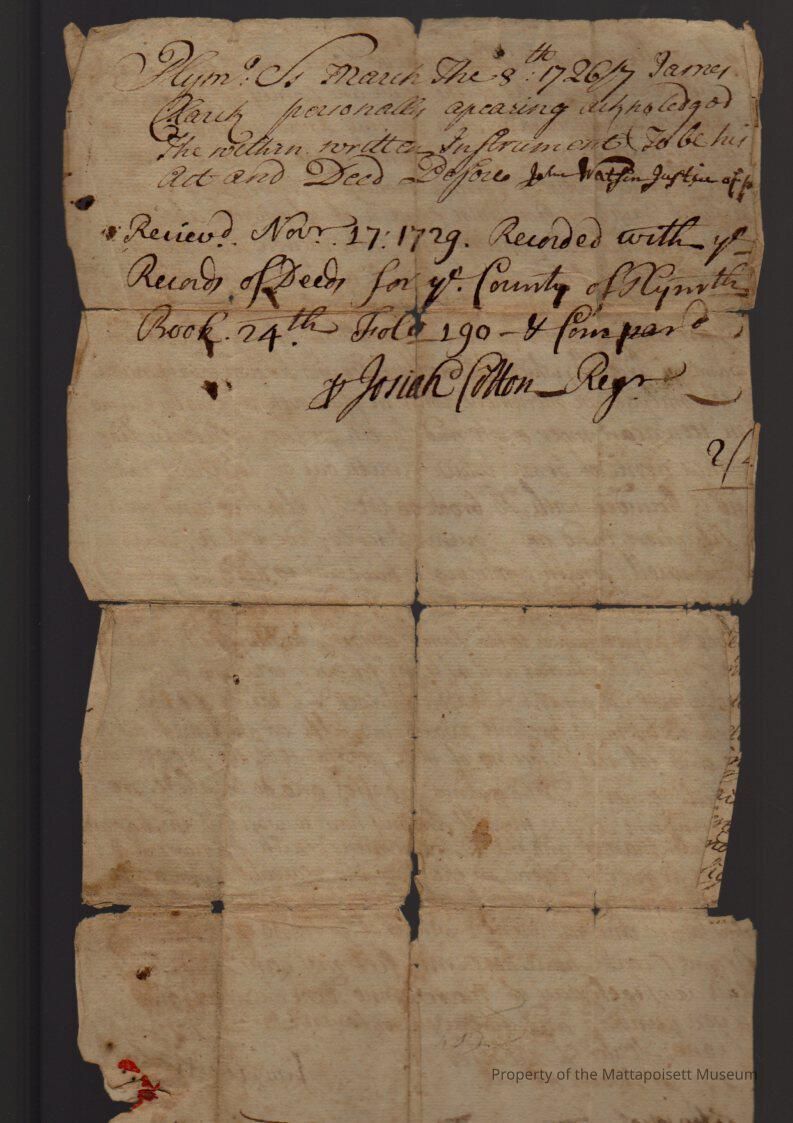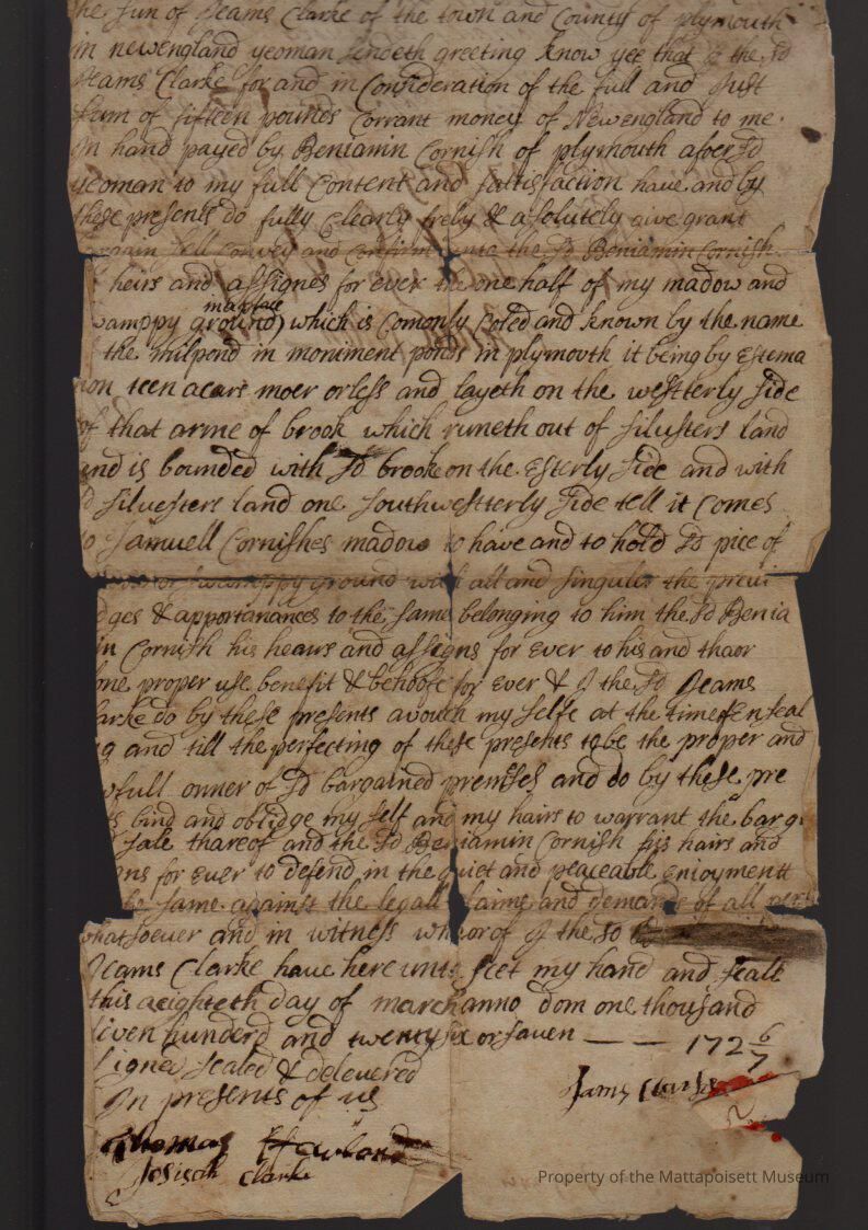 Quitclaim deed, James [Jeams] Clarke (yeoman) to Benjamin Cornish (yeoman). Recorded November 17, 1729, book 24, folio 190.Collection