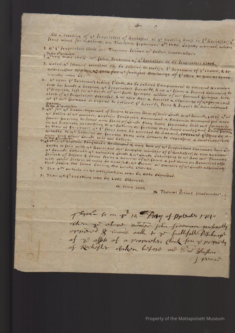 A "true copy" of a meeting of the proprietors of Rochester at the meeting house, legally warned. Thomas Prince of Boston as moderator.Collection