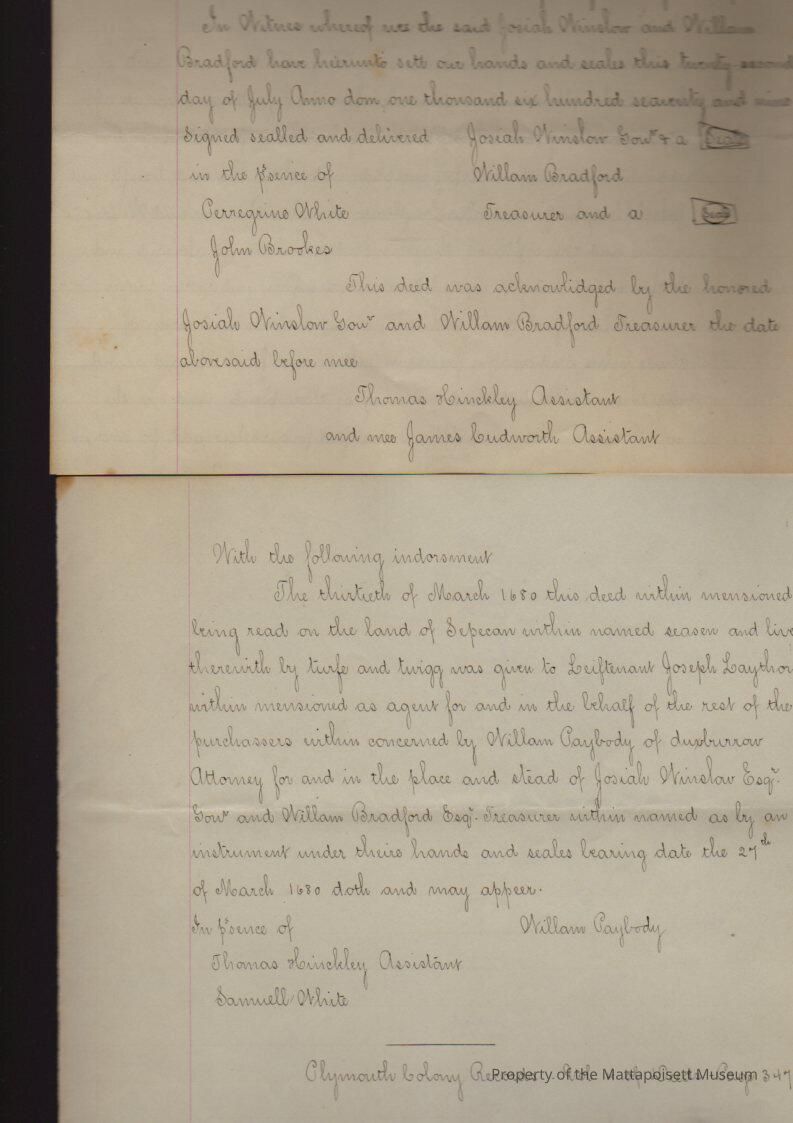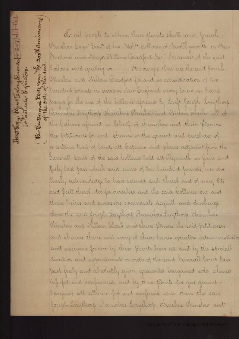 Copy of a deed from Book 4, page 347 to Rochester Propriters. Bi-centennial date was the 200th anniversary of the date of this deed. Josiah Winslow and William Bradford to Joseph Laythrop, Barnabas Laythrop Kanelme Winslow and William Clarke, tract of land in Sepecan.Collection