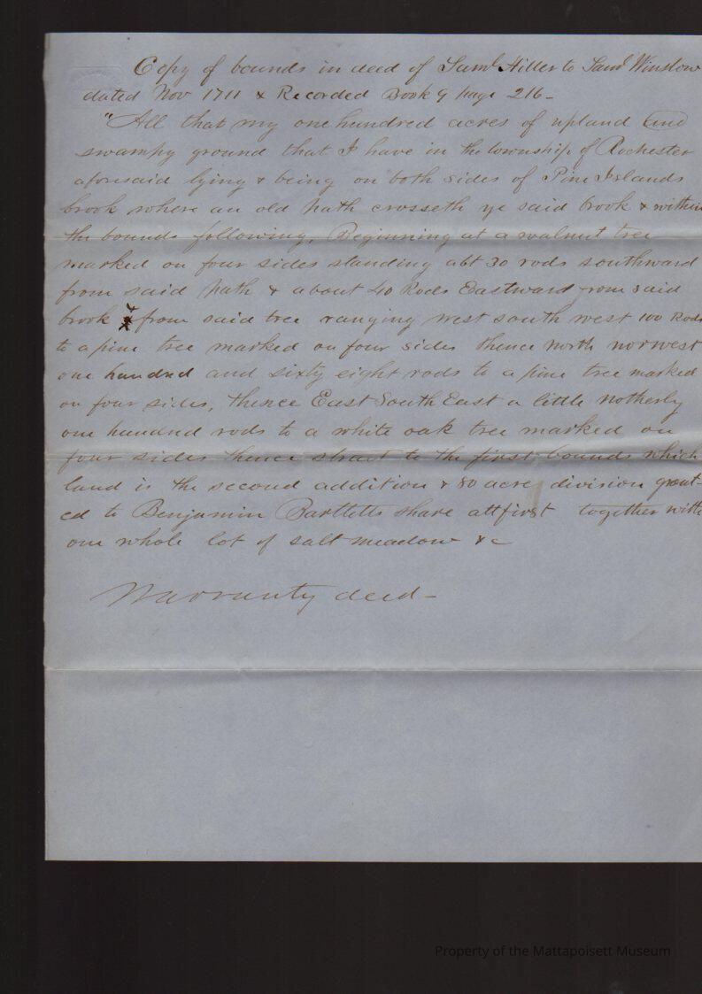 Copy of bounds in deed of Samuel Hiller to Samuel Winslow dated Nov. 1711 & recorded book 9, page 216. Warranty deed.Collection