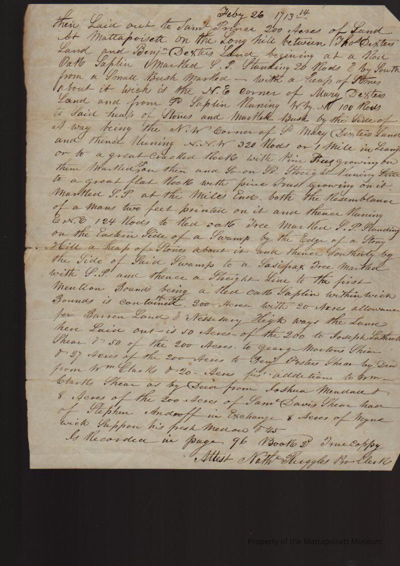 Copy of deed for land laid out to Samuel Prince, 200 acres at Mattapoisett on the long hill between Thomas Dexter land and Benjamin Dexter land. Recorded book 2, page 96.Collection