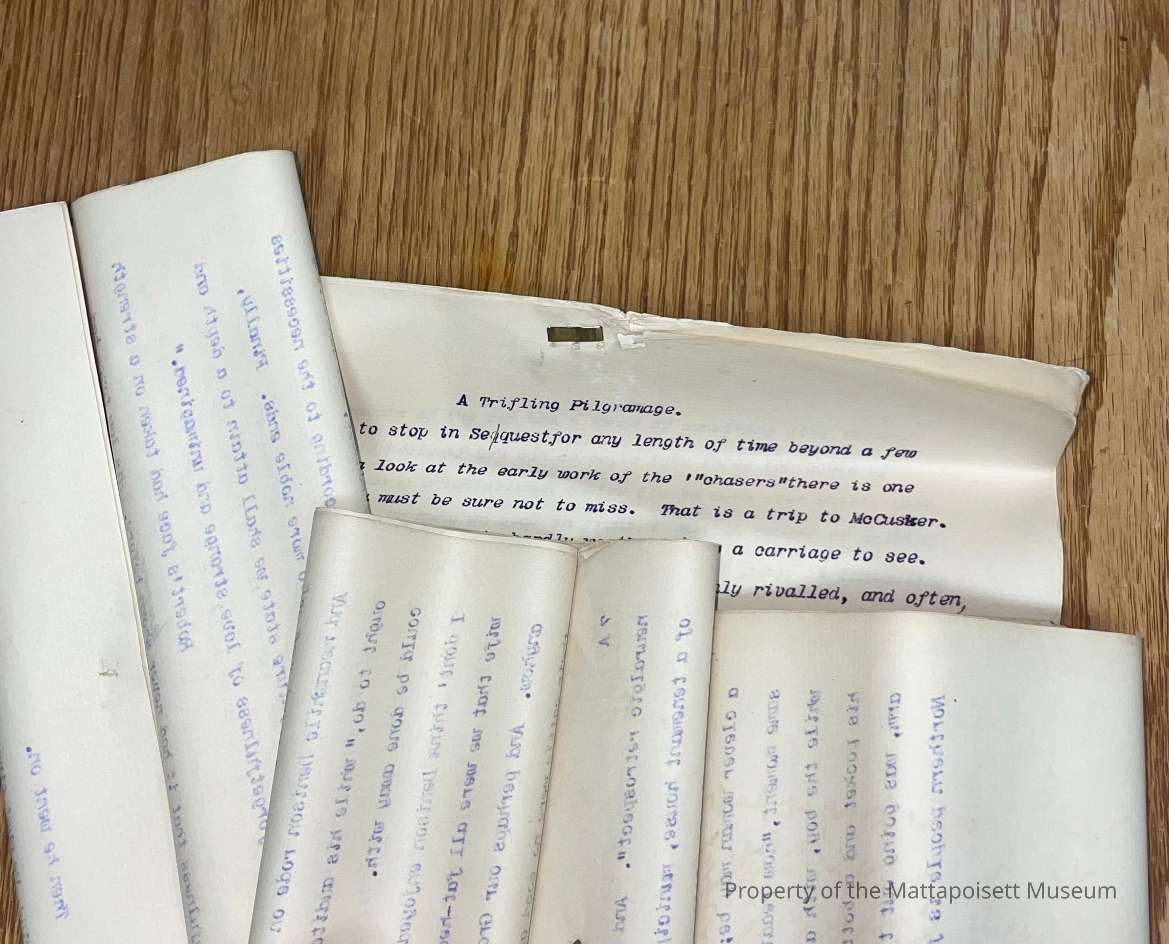 Everything in the collection (letters, manuscripts, typewriter, wedding dress, documents, books) was found in the attic of 18 Pine Island Road, Mattapoisett in 2022 and donated by the new house owners. This house was owned by Harrington and his wife. They subdivided the land and created Winnatuxett Beach Rd. George and Marian Harrington were the first couple ever married in St. Philips Church on Water Street. They were married in 1898.