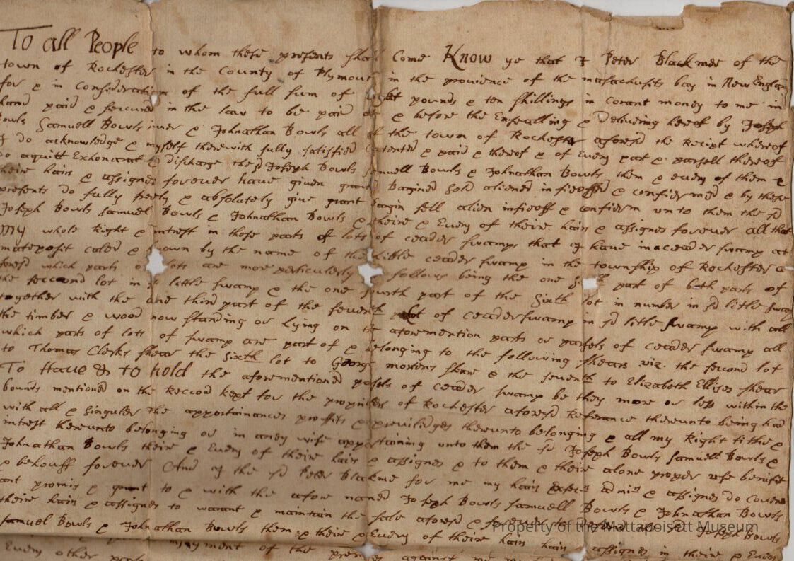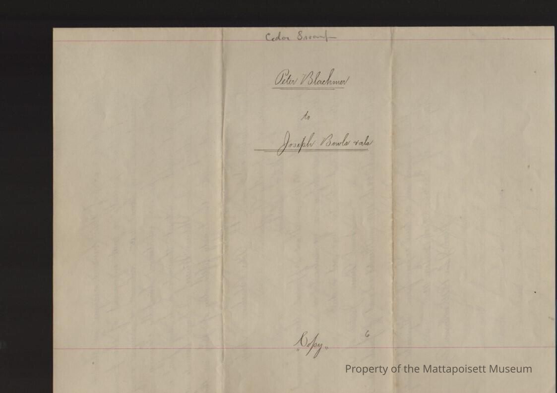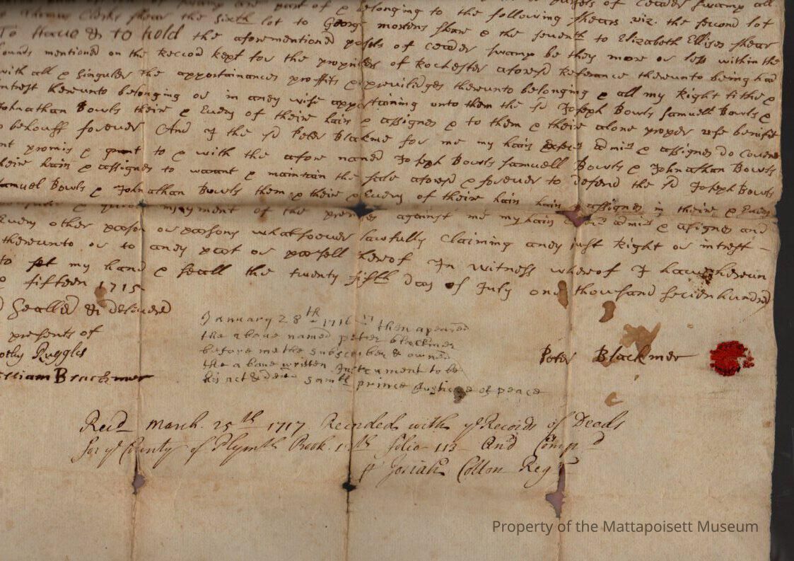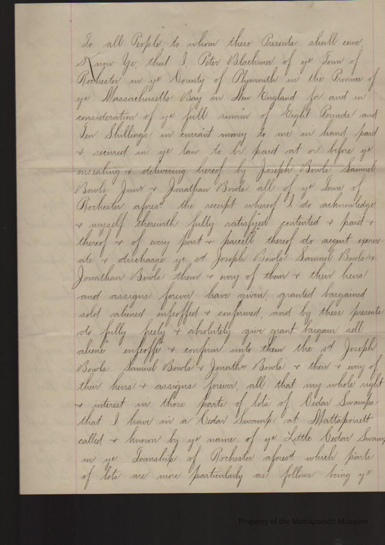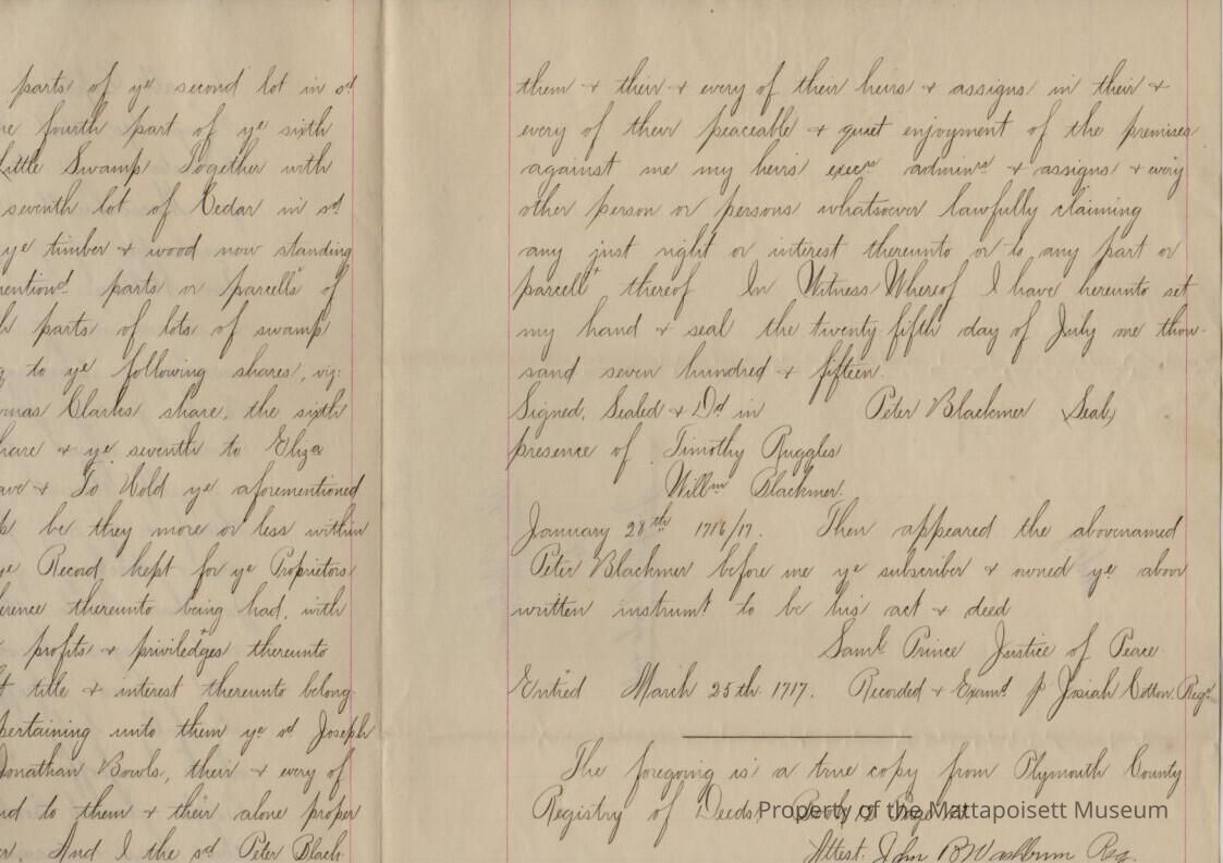 Quitclaim deed, Peter Blackmor[e] to Samuel Jr. Bowles and Jonathan Bowles and Joseph Bowles. "all that whole right and interest in those parts of lots of Cedar Swamp at Mattapoisett". Recored March 25th 1717, book 12, folio 113. Original and "true copy" transcript.Collection