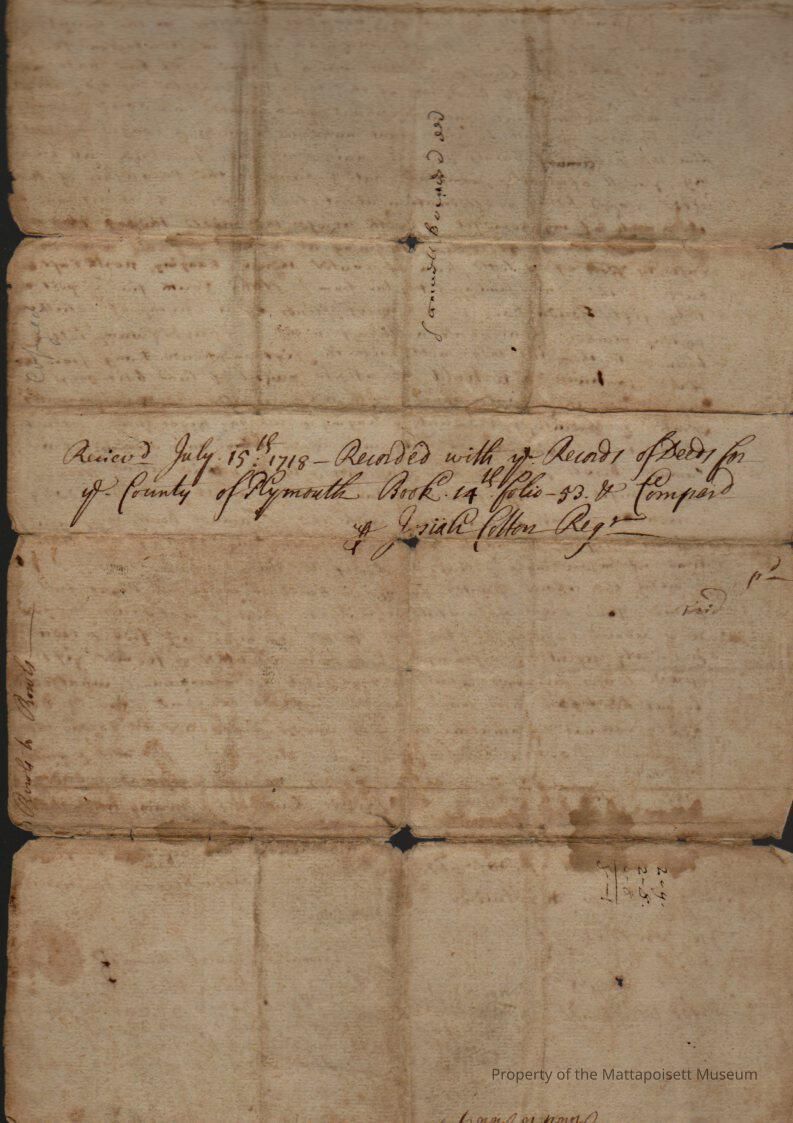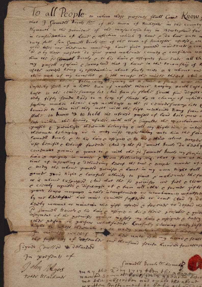 Quitclaim deed, Samuel Bowls Sr. to son, Samuel Bowls Jr "my parcell of upland and swamp land, about 40 acres. Recorded July 15th 1718, book 14, page 53. Copy from January 16, 1898.Collection