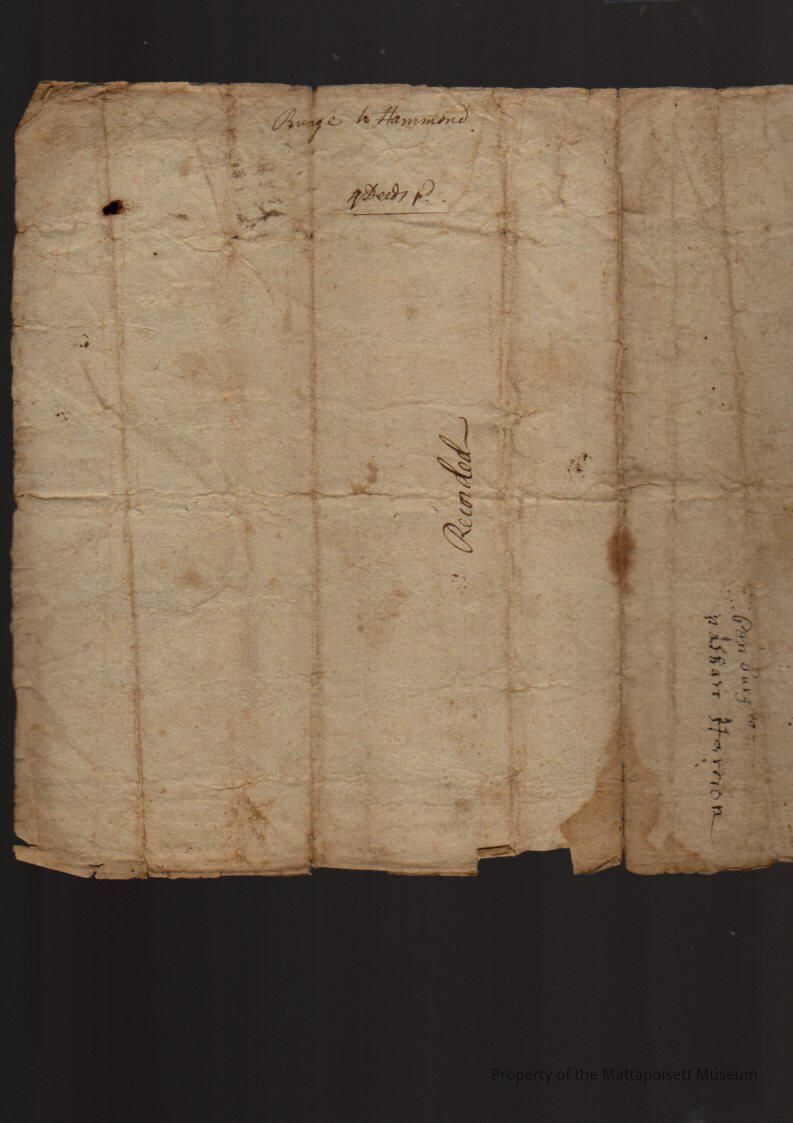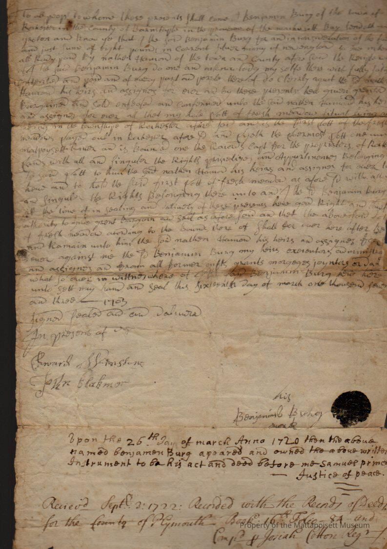 Quitclaim deed, Benjamin Burg to Nathan Hammond, meadow. Recorded September 3, 1722, book 16, folio 84.Collection