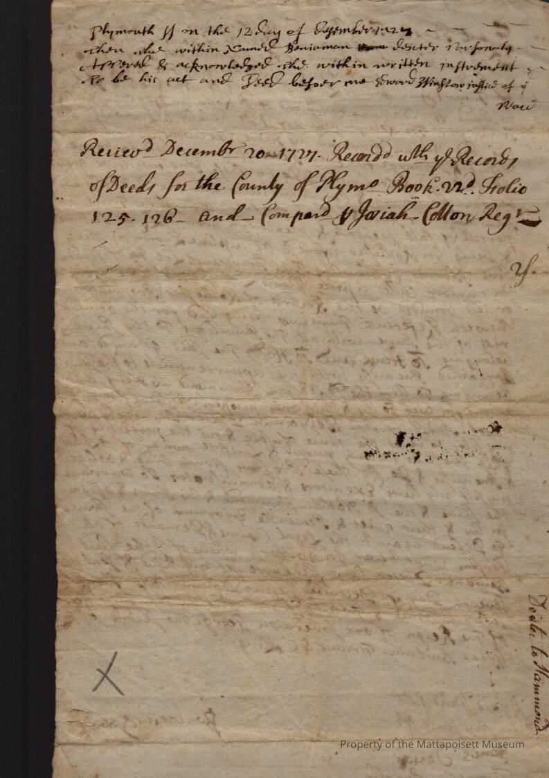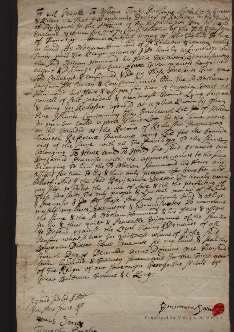 Quitclaim deed, Benjamin Dexter (yeoman) to Nathan Hammond, salt meadow at Pine Island, fourteenth lot. Recorded Debember 20, 1727, book 22, folio 125-126.Collection
